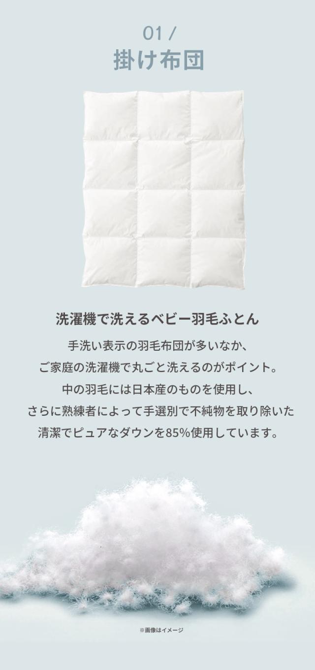 | 汗っかきな赤ちゃんだからこそ、羽毛布団をおすすめしています!ダウンを85%使用した羽毛布団はふかふかで軽く、放湿性にも優れているのでムレにくくて快適。中の羽毛には日本産のものを使い、さらに熟練者により手選別で不純物をとりのぞいた清潔でピュアなダウンを使用。生地から縫製まで一貫して日本生産にこだわった安心のおふとんです。 | |