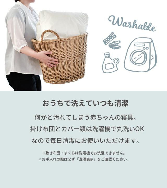 | お手入れ | 〇赤ちゃんは汗かきです。ときどき日に干すか布団乾燥機で乾燥させ、衛生的に保ちましょう。 〇掛け布団をお洗濯の際は必ず洗濯ネットをご使用の上、高水位で単独で洗ってください。 〇敷き布団・まくらは洗えません。 〇痛みや汚れを防ぐため、カバーやシーツを掛けてお使いください。 〇敷き布団は衛生的に保つため、キルトパットや防水シーツの併用をお薦めします。 |