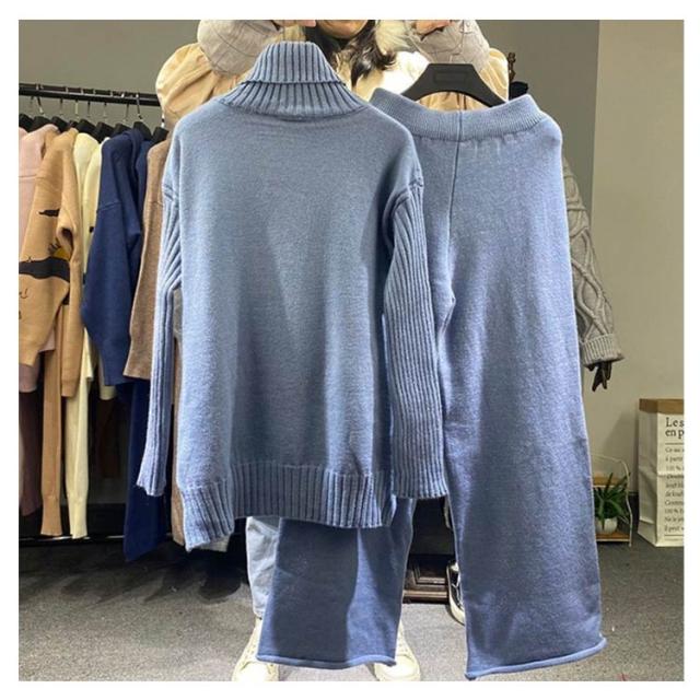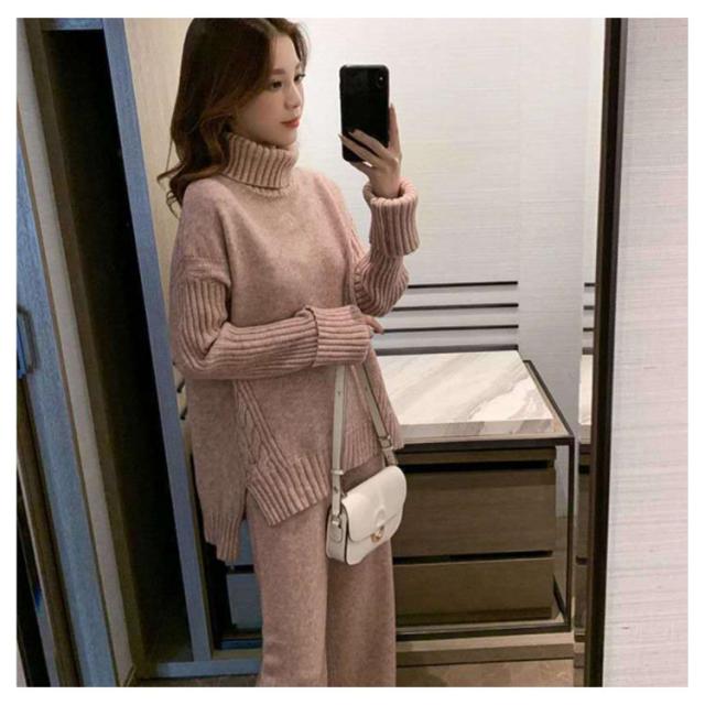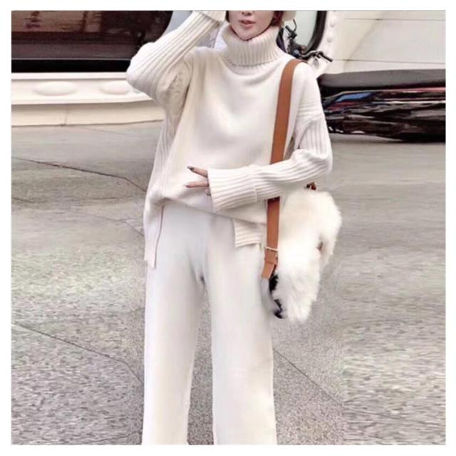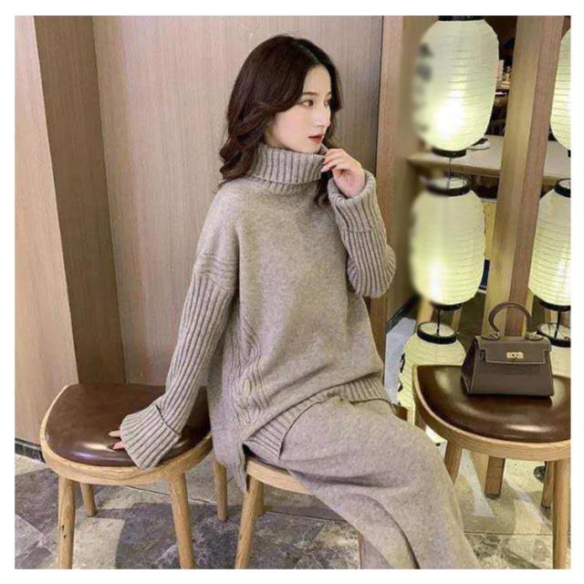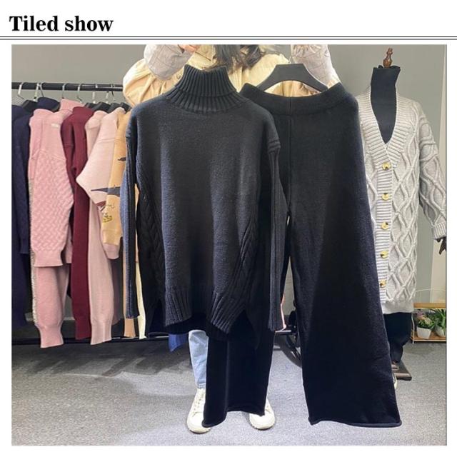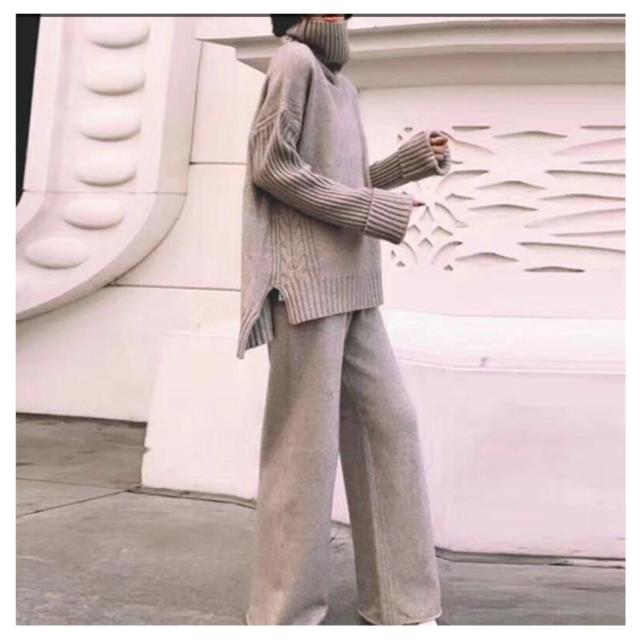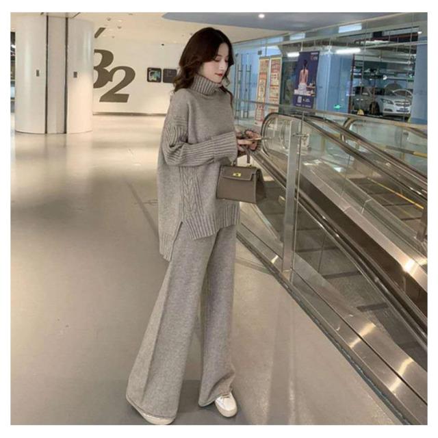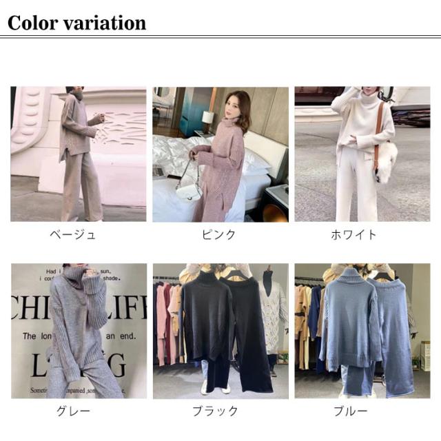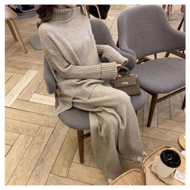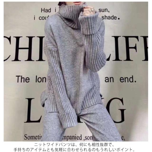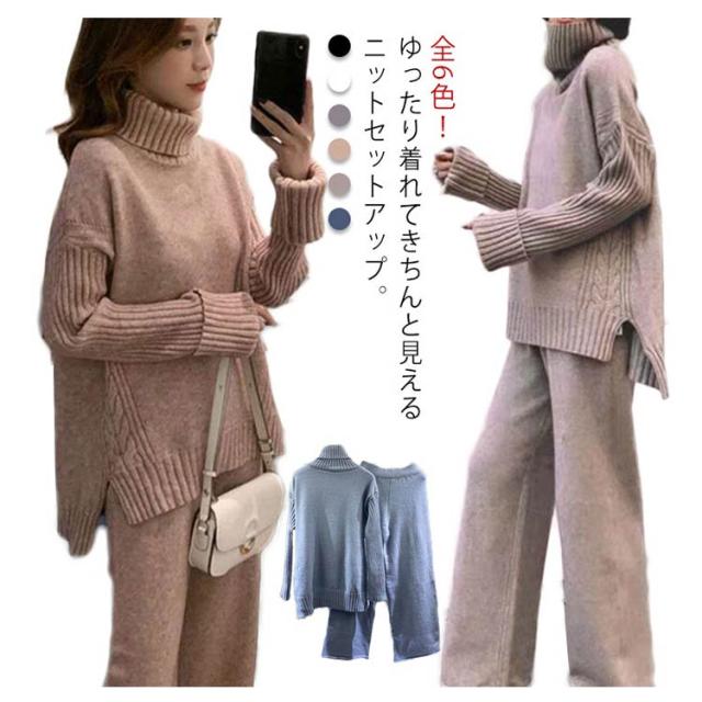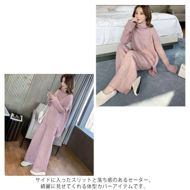 セットアップ レディース 秋冬 ニット セットアップ ニットセーター プルオーバー パンツスーツ 2点セット ニットトップス ワイドパンツ ニット プルオーバーセーター 上下セット カジュアル 長袖 ゆったり リブニット サイドスリット