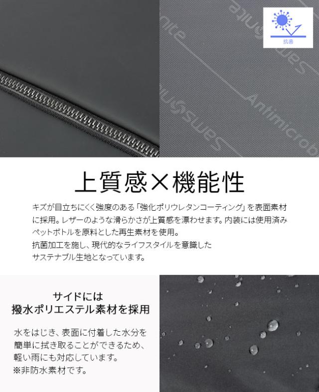 | ・デザイン性と軽量性、機能性のバランスを重視したビジネスコレクションで、「グッドデザイン賞2021」を受賞。 ・働く場所にとらわれないワーキングスタイルの変化に合わせたデザインが特徴。 ・本体フロントパネルには強化ポリウレタンコーティングを施した素材を使用し、表面にキズが付きにくくしています。 ・サイドには撥水ポリエステル素材を採用しているため、軽い雨にも対応可能。 ・内装生地には抗菌加工されたリサイクルPETボトルを100%原料とする再生素材が使われています。 ・PCポケットは内装・外装両方からアクセス可能で、ツールを効率的に収納できるポケットも各所に装備。 ・バックパックとして設計されていますが、ブリーフケースタイプとしても使えるようにサイドハンドルを備えています。 ・内装および外装のファスナーポケットは、タテ方向やヨコ方向の使用時にも対応できるようにL字構造になっており、使いやすさを考慮。 |