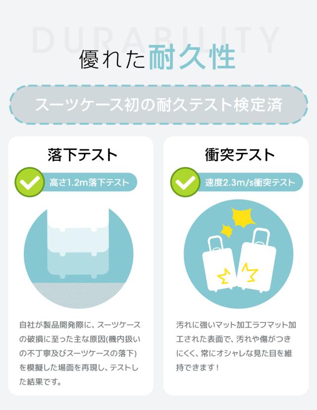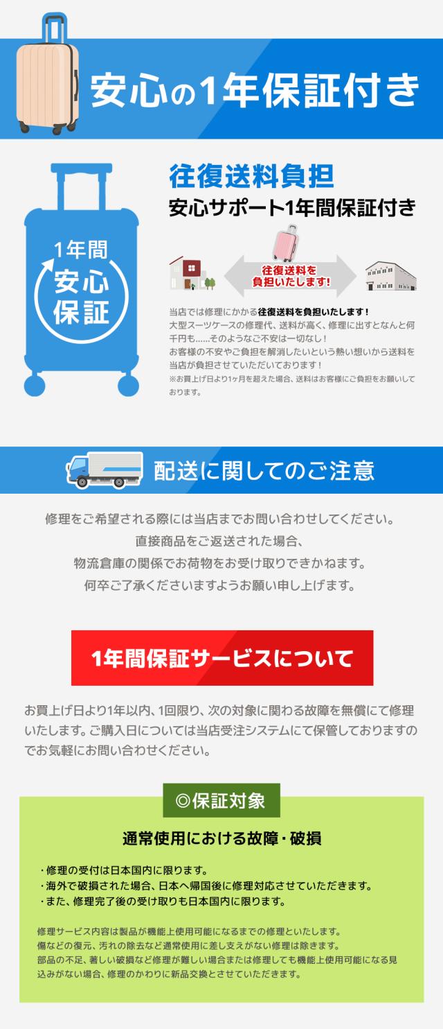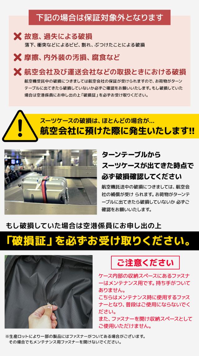 ※航空会社の取扱いにより生じた破損、通常使用により生じた傷などは保証対象外となっております。詳細は保証説明をご確認ください。