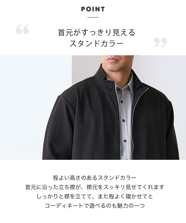 スタンドカラーの縦ラインと袖と裾のリブでスッキリとしたきれいめのシルエット