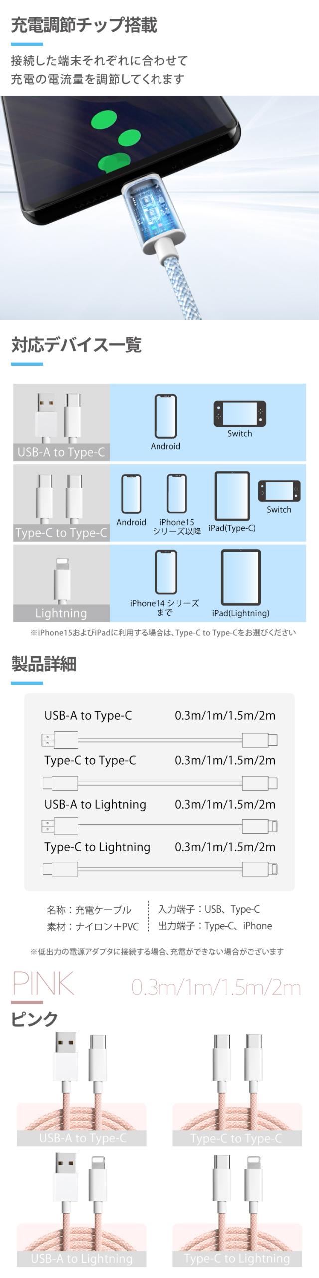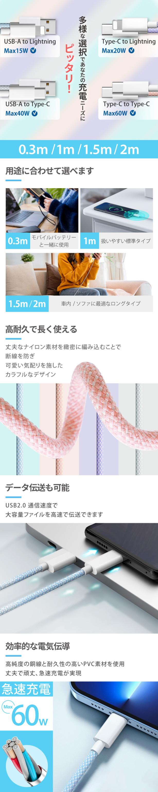 ケーブル 充電器 iPhoneケーブル iPhone 充電ケーブル Type-C USB ナイロン 2m 1.5m 1m 0.3m Apple アップル アンドロイド 急速充電ケーブル 最大60W iOS typec usb ライトニングケーブル PVC 充電コード 断線防止 スマホ iPhone Android iPad MacBook Switch Galaxy Xperia A