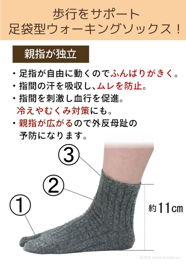 ■親指が独立している足袋型ソックスは、親指が自由に動かせるので足指で地面をとらえる歩き方ができます。 それによって指が鍛えられるので外反母趾の予防や、疲れにくい正しい歩行がしやすくなるといった効果があります。
