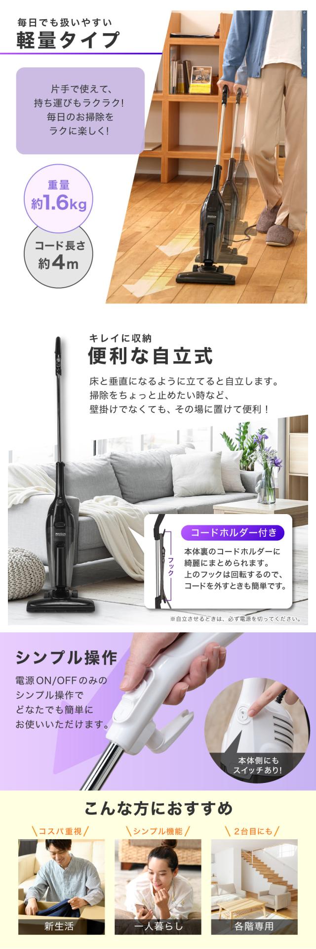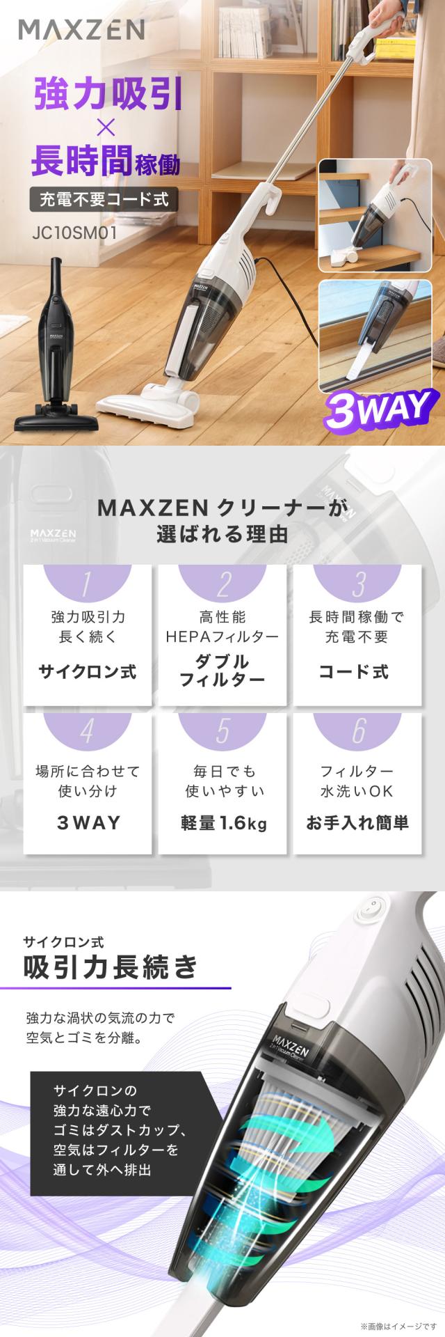 【TVで紹介されました】 掃除機 スティッククリーナー コード式 自立式 パワフル吸引 吸引力10000pa ダブルフィルター 簡単操作 紙パック不要 水洗いOK スティック ハンディ 充電不要 収納 軽量 サイクロン 黒 ブラック JC10SM01-BK マクスゼン