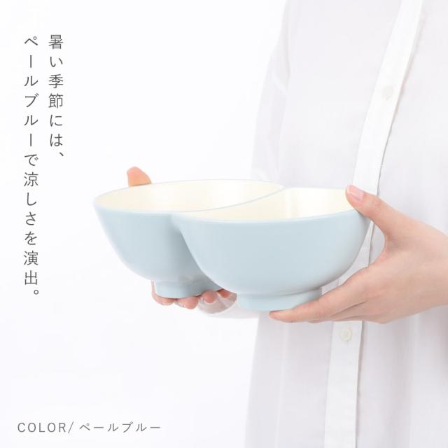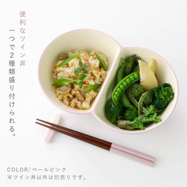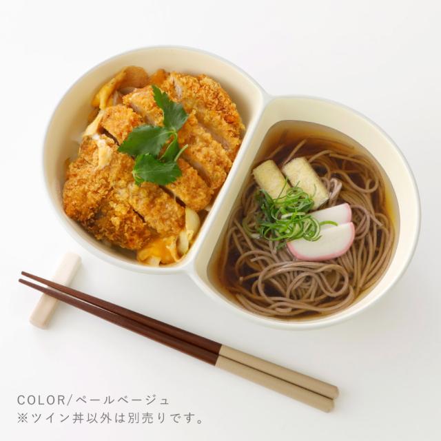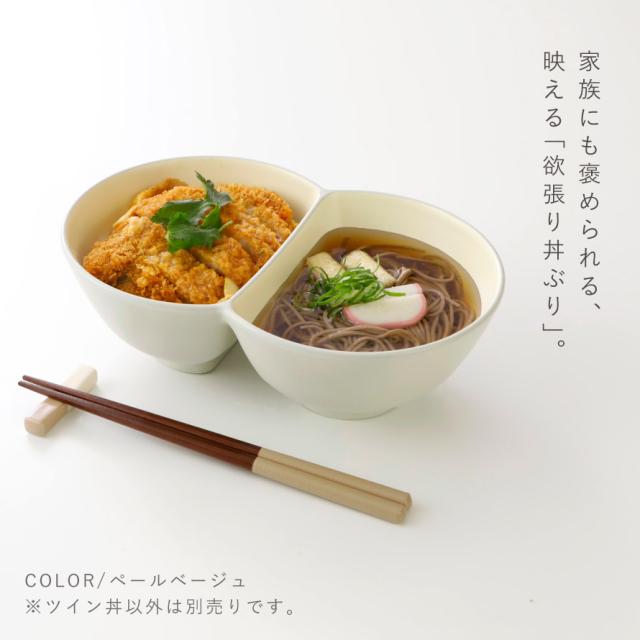 盛り付けが一つで叶うツイン丼。2種類盛り付けられるので、どんぶりとうどん、うなぎ丼にお蕎麦など楽しい組み合わせができる器です。洗い物も少なくなるので家事も楽ちんです。