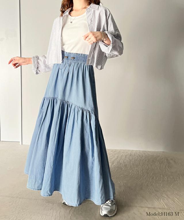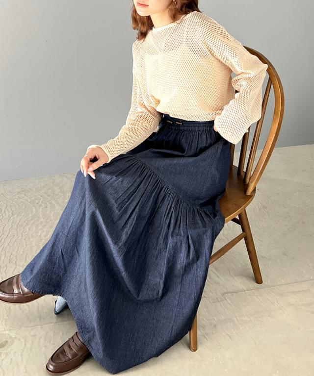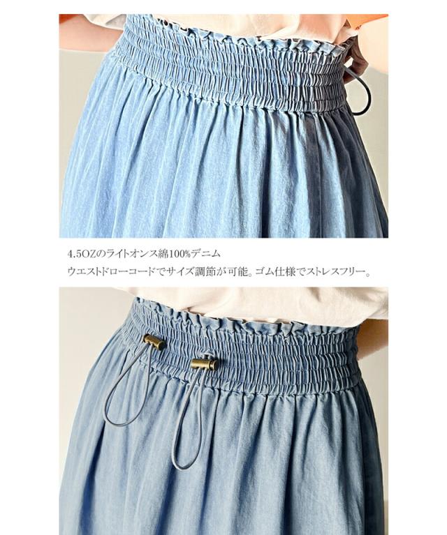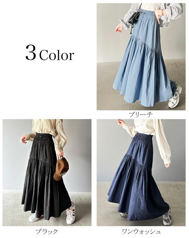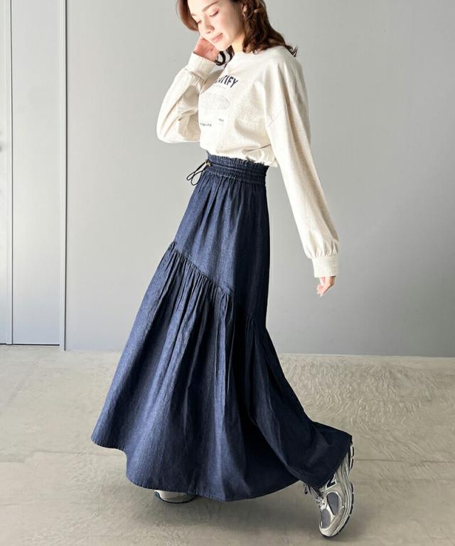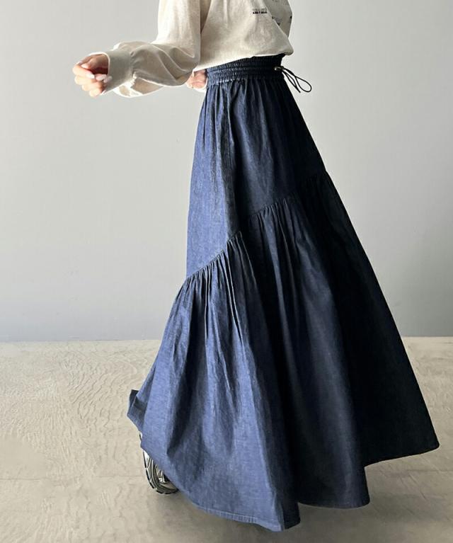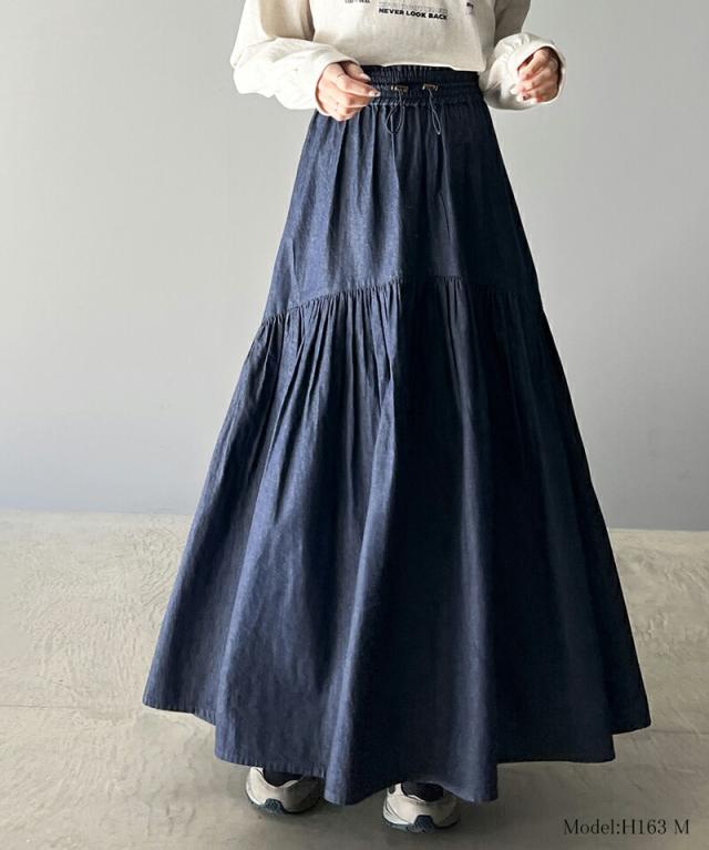 クラシカルエルフ 夏新作 ボトムス スカート レディース 綿 100% デニム ティアード フレアスカート ラウンド ギャザー ロング丈 ウエスト ドロスト ゴム ゆったり 体型カバー ふんわり シルエット 高見え 大きいサイズ 2024ss ce1260094