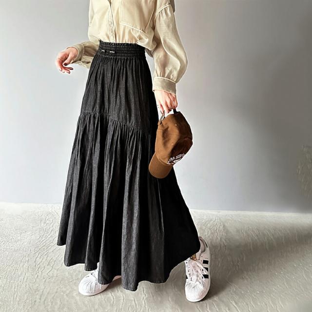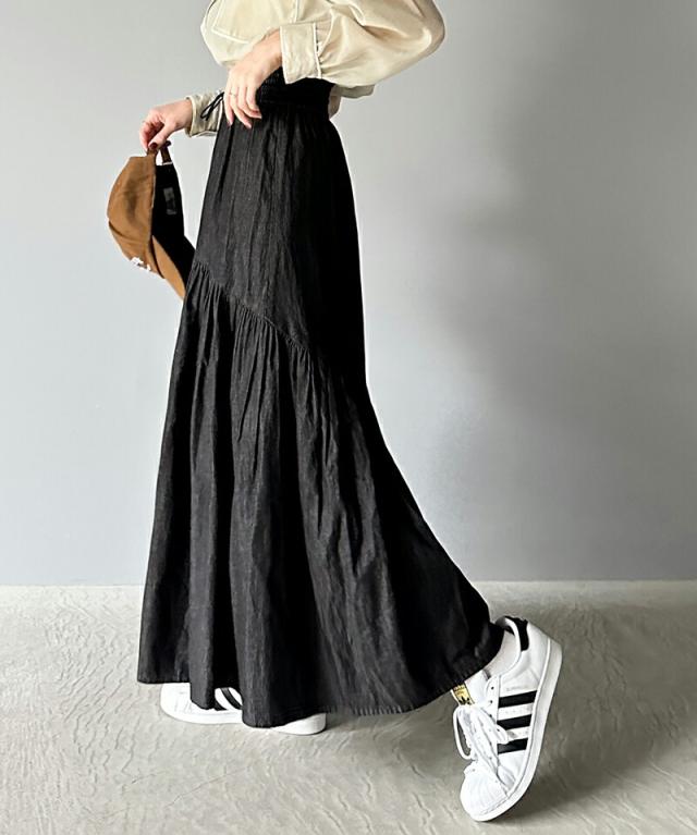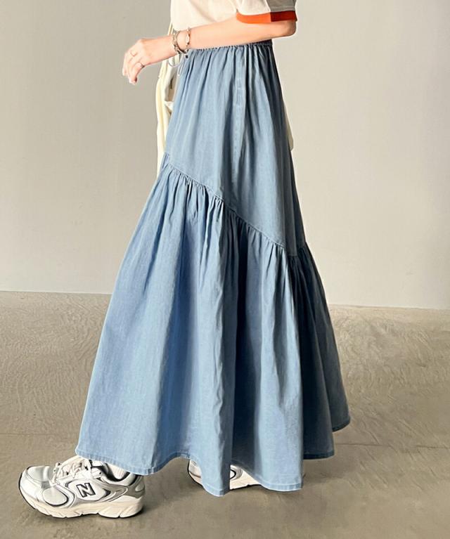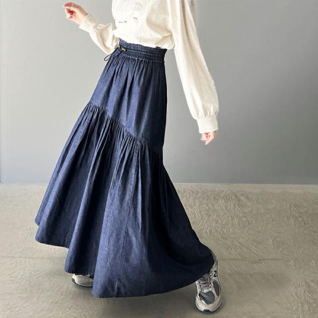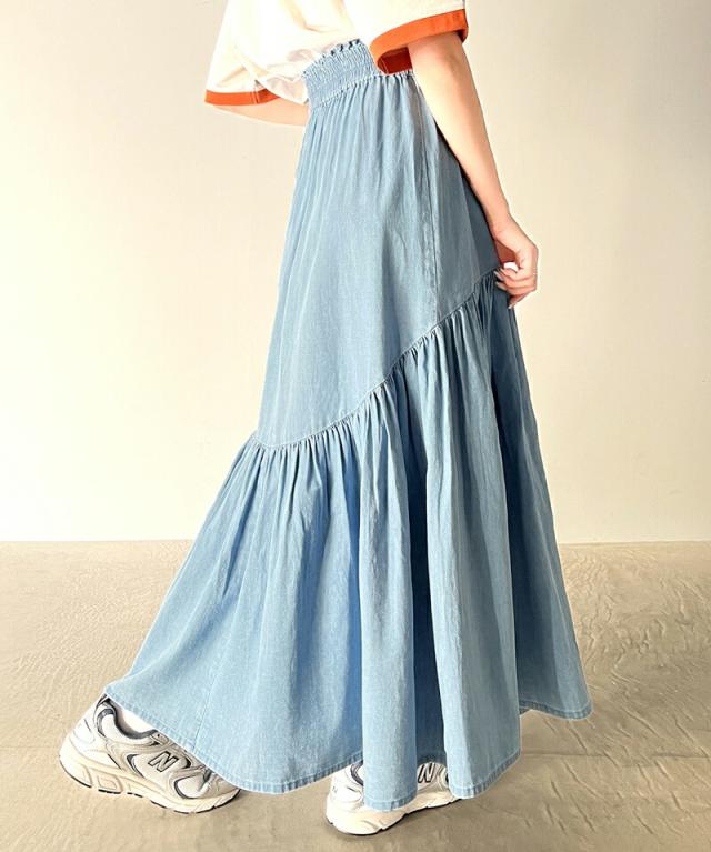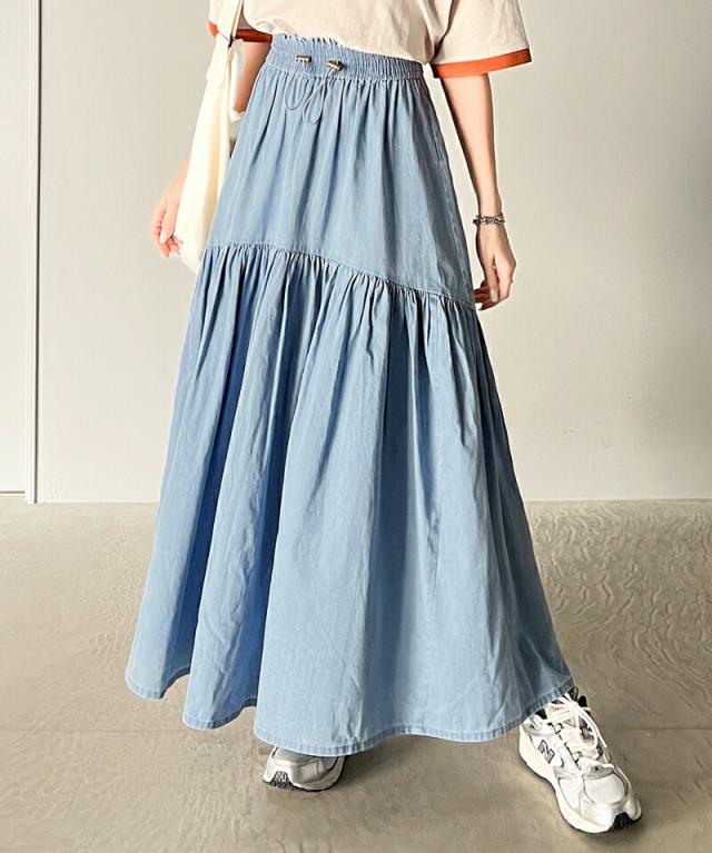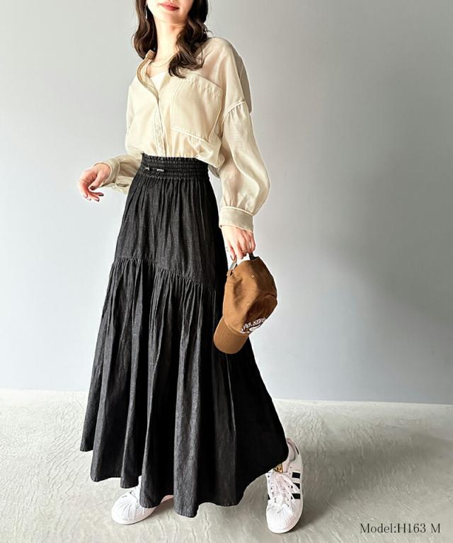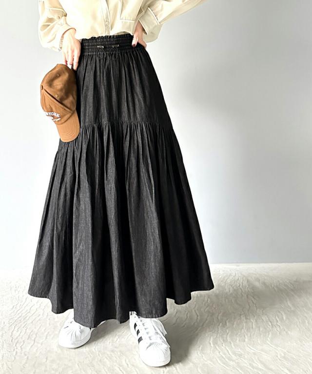 クラシカルエルフ 夏新作 ボトムス スカート レディース 綿 100% デニム ティアード フレアスカート ラウンド ギャザー ロング丈 ウエスト ドロスト ゴム ゆったり 体型カバー ふんわり シルエット 高見え 大きいサイズ 2024ss ce1260094
