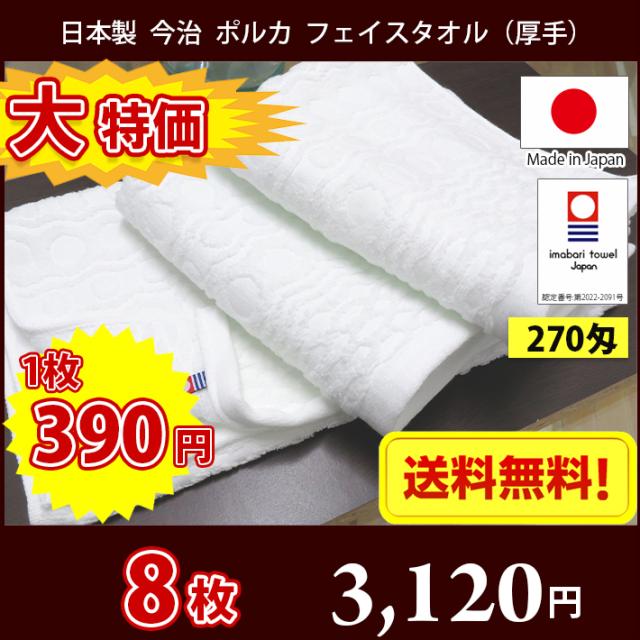 【送料無料】大特価!8枚セット 日本製 今治 270匁 ポルカ フェイスタオル 厚手 ホテル仕様 / 今治タオル フェイス まとめ買い ふっくら もっちり ホテルスタイル
