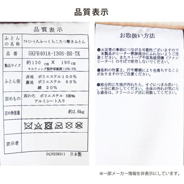 | ・もっちり厚みで、お尻の冷えをガード せっかくの暖かいこたつでも、そのまま床に座っているとお尻がひんやり。それなら、敷き布団もあたたかさにこだわりませんか。 お子様がはしゃいで走り回っても安心。ふかふか敷き布団のクッション性により、階下に響く生活音を軽減するので騒音対策としてもおすすめです。転倒時のケガ防止や床の傷つき予防にも◎お子様のいるご家庭やマンション暮らしの方におすすめです。 ・冬のリビングのマストアイテム床からの冷気を軽減できるので、こたつの敷き布団としてとっても優秀。長く座っていても疲れにくく、一般的なこたつ敷き布団よりも暖気を逃がさないので、冬場の節電対策にだってぴったりです。 ・ふかふかフランネルさらさらふわふわ、なめらかなタッチで撫でるだけでも気持ちいい。まとわり付くような感覚がなく、やさしい肌さわりで思わず寝そべりたくなる触れ心地。毛先が短く、光の角度やシワによっていろいろな表情を魅せてくれるのも魅力的です。 ・帝人ファイバー(株)がおくる高性能な中わた帝人ファイバー(株)が開発した吸汗性、速乾性に優れたポリエステル綿を使用。内部に湿気がこもりにくく、清潔にお使いいただけます。 ・冷気を通さず、熱を逃がさないアルミシート入!!アルミシートが床からの冷気を防ぎ、熱を下に逃がさないため保温性バツグン! コタツの設定温度を低くできますので、省エネ効果があり電気代の節約にもなります! | |