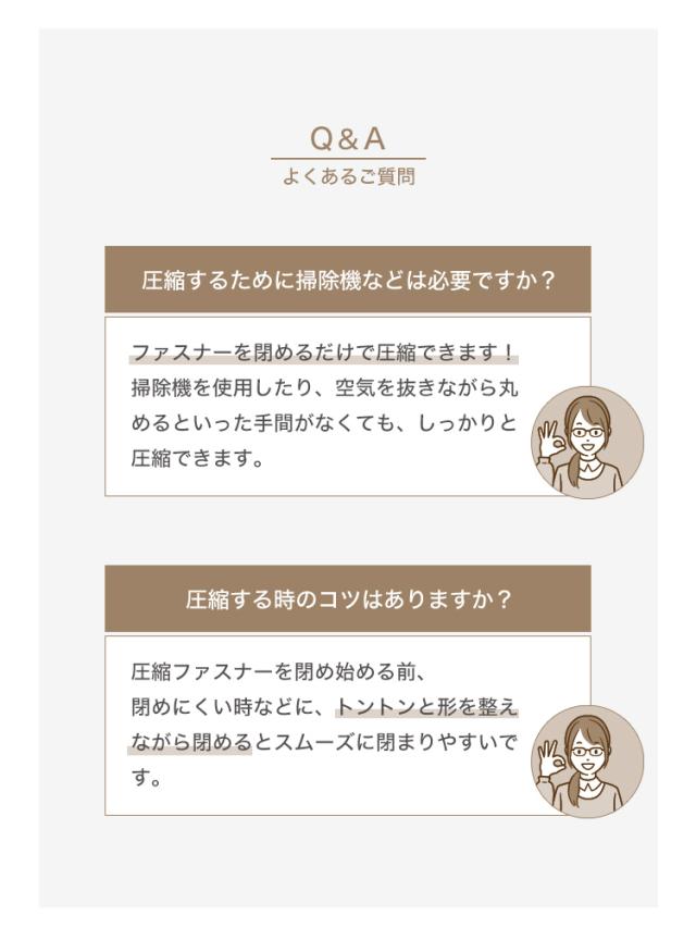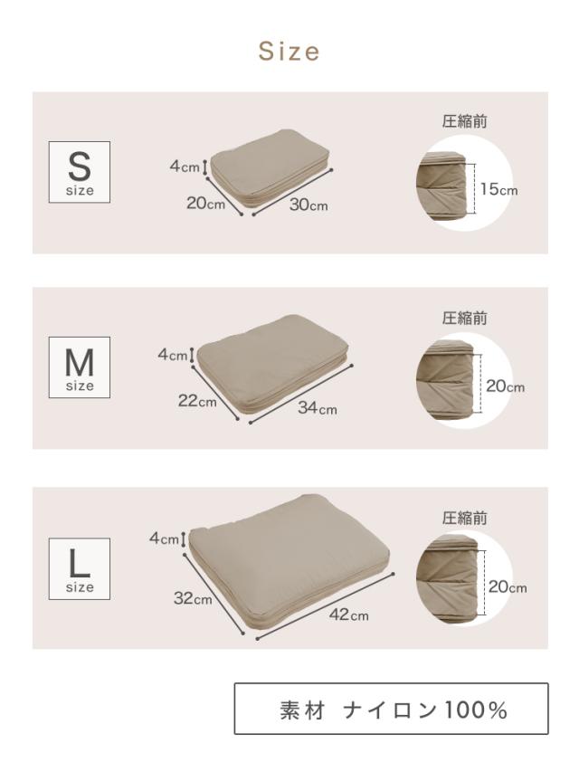 | サイズ | 【Sサイズ】(約)30×20×4cm 圧縮前厚さ:(約)15cm 【Mサイズ】(約)34×22×4cm 圧縮前厚さ:(約)20cm 【Lサイズ】(約)42×32×4cm 圧縮前厚さ:(約)20cm |