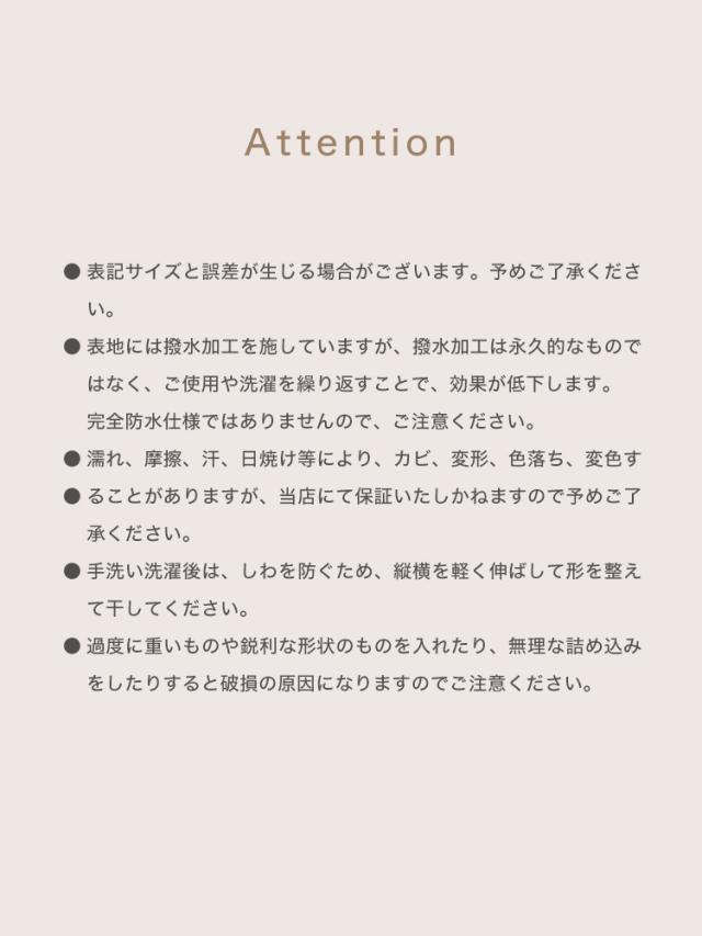 | 注意事項 | ・表記サイズと誤差が生じる場合がございます。予めご了承ください。 ・表地には撥水加工を施しておりますが、撥水加工は永久的なものではなく、ご使用や洗濯を繰り返すことで効果が低下します。 ・完全防水仕様ではございません。 ・手洗い洗濯後は、しわを防ぐため縦横を軽く伸ばして形を整えて干してください。 ・過度に重たいものや鋭利な形状のものを入れたり、無理に詰め込みをすると破損の原因になりますのでご注意ください。 ・商品は、モニターによって色合いが異なって見える場合があります。 ・仕様・デザインは改良のため予告なく変更することがあります。 |