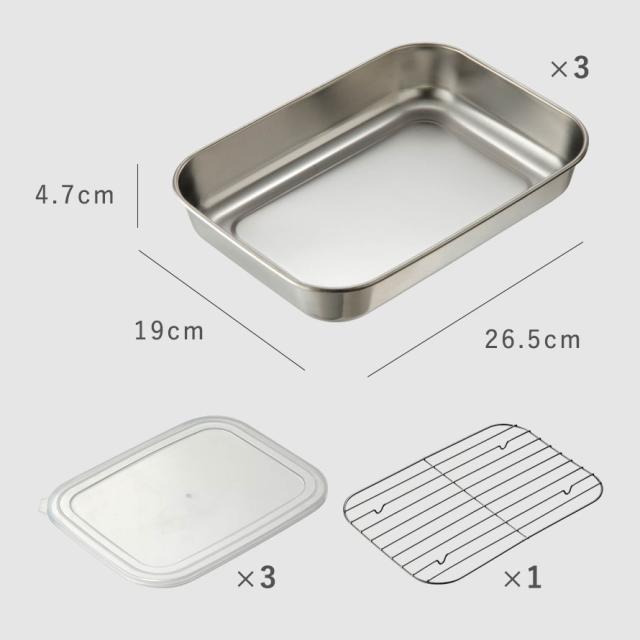 幅26.5×奥行19×高さ4.7cmと、使いやすい大サイズのバット3枚セット。樹脂蓋、アミ1枚が付属しています。