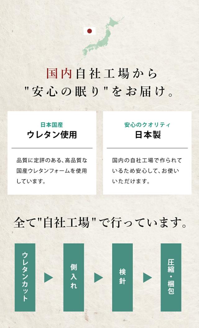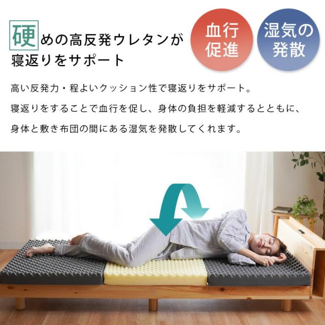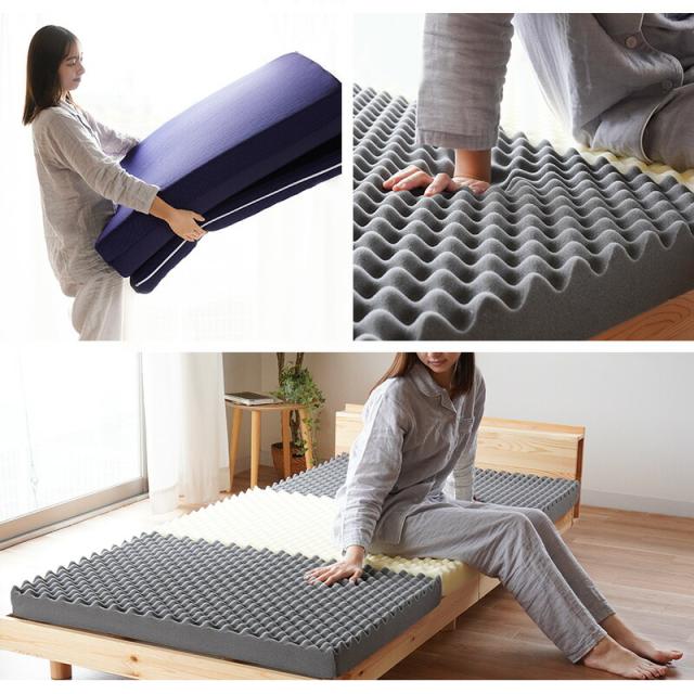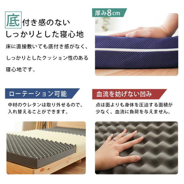 | 【国内有名メーカーアキレス社製ウレタン使用】国内有数メーカーのマットレスにも使用されている国内有名メーカーアキレス社製のウレタンを使用。 特に体重のかかる中央部分(腰部)を硬めにしたバランス構造。背中、腰部分の沈み込みが少なく、腰への負担を軽減します。腰痛でお悩みの方にもおすすめです。 ・硬めの高反発ウレタンが寝返りをサポート高い反発力・程よいクッション性で寝返りをサポート。寝返りをすることで血行を促し、身体の負担を軽減するとともに、身体と敷き布団の間にある湿気を発散してくれます。 ・理想的な寝姿勢をキープする形状一つ一つの「点」が優しく全身を支えてくれます。この形状で身体に合わせて体圧分散し、立ち姿に近い理想の寝姿勢をキープします。 ・底付き感のないしっかりとした寝心地床に直接敷いても底付き感がなく、しっかりとしたクッション性のある寝心地です。 側生地はサラッとした肌触りで通気性が抜群のメッシュ素材を使用しています。側面にはファスナーが付いているため、外して丸洗いが可能です。 折りたたみ簡単な三つ折りタイプ。使わないときは立てかけて湿気対策ができます。コンパクトに収納できるので来客用にもおすすめです。 ・搬入しやすいロール梱包でお届けマットレスを圧縮することで、スムーズな搬入やコスト削減に。 | |