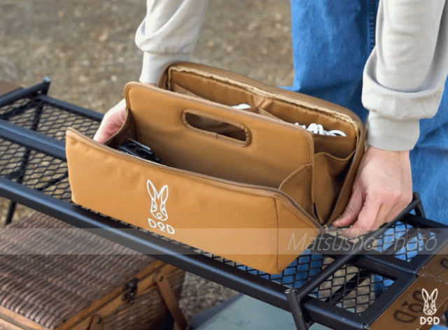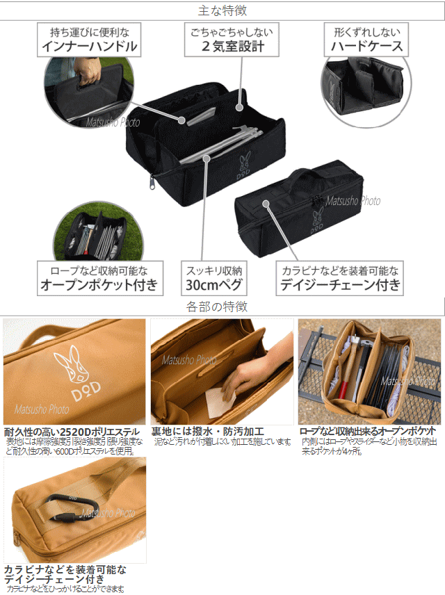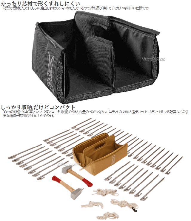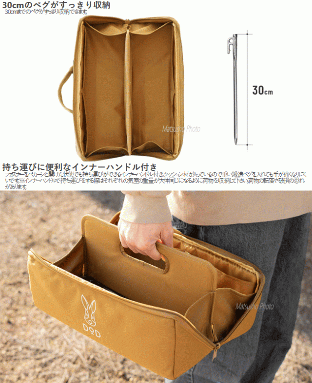 ペグを取り出しやすい様にファスナーをパカーンと開ける事ができます。大きく開くので必要なものがすぐ見つかります。ペグの長さや種類に応じて分ける事が出来る2気室仕様。30cmまでのペグがすっきり収納できます。ファスナーをパカーンと開けた状態でも持ち運びができるインナーハンドル付き。クッション材が入っているので重い鍛造ペグを入れても手が痛くなりにくい。箱型で板材も入っておりしっかり自立します。クッション材も入っているので持ち運び時にカチャカチャなりにくい仕様です。30cmの鍛造ペグ40本、ハンマー2本とロープが収納ができる大容量のペグバッグ。大型テントやドームテント+タープの設営等に必要な道具一式を収容する事ができます。■カラー:キャメル■サイズ約W34×D13×H13cm(ハンドル部分を除く)約W34×D13×H17cm(Hはハンドル部分を含む)■総重量約450g■静止耐荷重各気室5kg(合計10kg)■セット内容:製品本体※ペグ・ロープ・ハンマー等は付属しておりません。インナーハンドルで持ち運びをする際はそれぞれの気室の重量が大体同じになる様に荷物を収納して下さい。