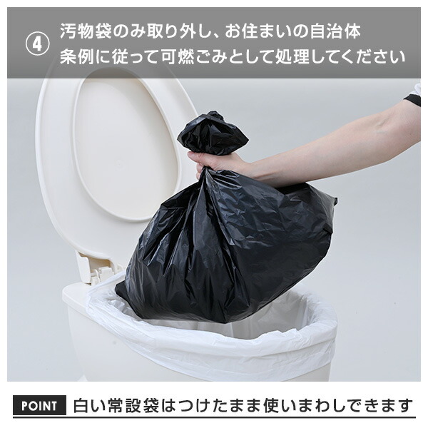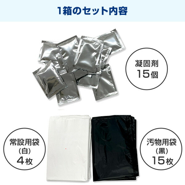 | 商品説明 | ●1箱で15回分 ●1箱当たりのセット内容:汚物用黒袋15枚、白袋(65×45cm)4枚、凝固剤15袋(消臭剤入り) ●凝固剤と消臭効果でサッと固めてニオイも防ぐ! ※消臭効果はアンモニア臭に対する効果です ●水が使えないときも簡易トイレが手軽にできる ●ご使用方法: ・便器からの汚れ防止の常設袋を下に敷き、汚物袋をせっとします ・便座で押さえしっかり固定させます ・使用後、汚物全体に均等に凝固剤をふりかけます ・汚物袋のみ取り出して口を結び、処理袋にまとめて廃棄します ●洋式トイレがない時もバケツ等で対応可能 |