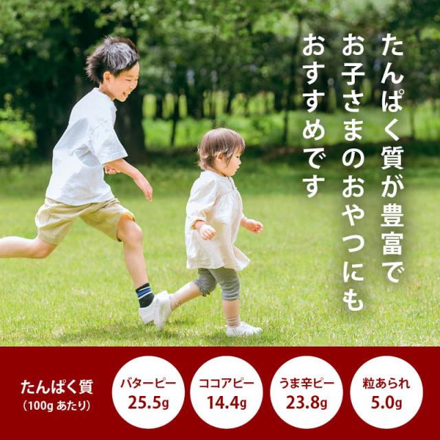 ◆原材料:◆バターピー落花生:(中国)、植物油、食塩、◆ココアピー:落花生(中国)、砂糖、ココアパウダー、でん粉、食塩、◆うま辛ピー:落花生(中国)、小麦粉、しょうゆ加工品(醤油、砂糖、その他)、砂糖、寒梅粉ミックス(澱粉、米粉)、澱粉、植物油、海苔】、◆小粒餅:でん粉(アメリカ産トウモロコシ使用、国内製造)、米(国産)、砂糖、しょうゆ、デキストリン、ガーリックパウダー、発酵調味料、唐辛子/加工デンプン、調味料(アミノ酸等)、カラメル色素、パプリカ色素、ベニコウジ色素、香辛料抽出物、(一部に小麦?大豆を含む)
