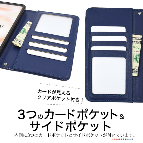 衝撃やキズなどから守ります。 また、内部はソフトケースなので着脱が簡単です。 背面を折り返すとスタンドとして使用できるので、動画視聴に便利です。 落下防止に最適なストラップとストラップホール付きです。 横開きタイプなので、手帳のように使うことができます。 また、内側に3つのカードポケットとサイドポケットが付いています。 | ||||||||||||||