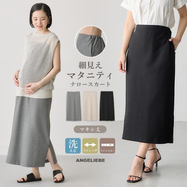 マタニティ スカート ロング マキシ スカート タイトスカート 綿混 カットソー Iライン マキシスカート カジュアル ベージュ グレー ブラック アジャスター ゴム 無地 妊婦 産前 産後 臨月 スリット すっきり 春 夏 秋 かわいい おしゃれ シンプル エンジェリーベ