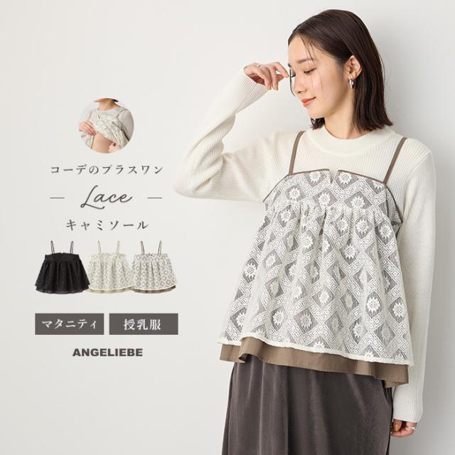 マタニティ キャミ トップス レイヤードキャミソール ビスチェ フレアトップスギャザー おしゃれ レース ブラック ベージュ カーキ 授乳服 授乳 妊婦 産前 産後 臨月 スリット すっきり 春 夏 秋 かわいい おしゃれ シンプル エンジェリーベ
