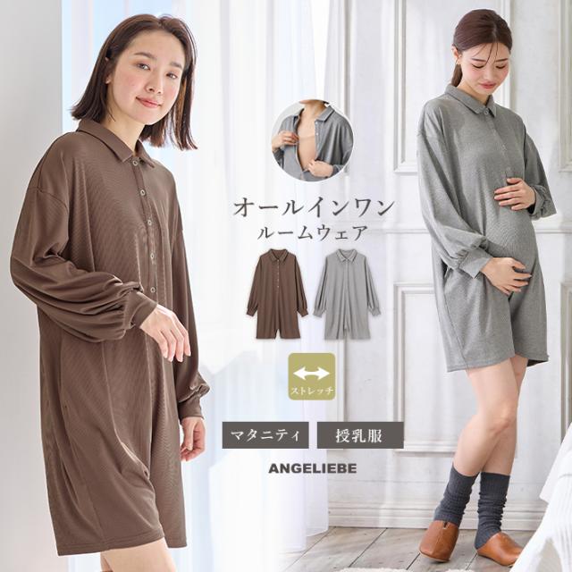 マタニティ ルームウェア 前開き パジャマ オールインワン ハーフパンツ 部屋着 つなぎ ロンパース 大人 長袖 ブラウン グレー ショートパンツ カジュアル 無地 授乳服 授乳 妊婦 産前 産後 臨月 すっきり 春 夏 秋 かわいい おしゃれ シンプル エンジェリーベ