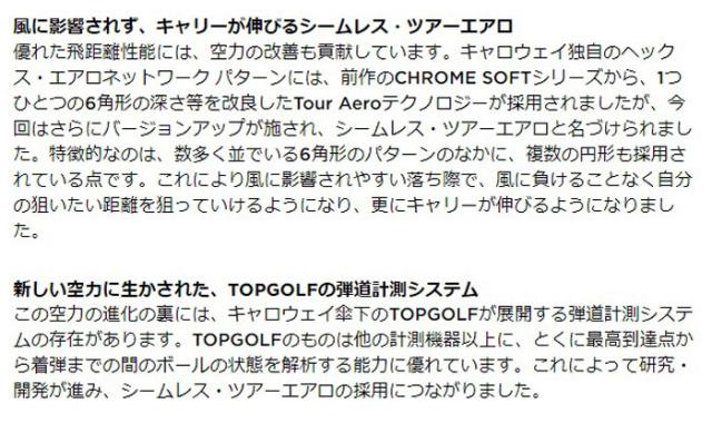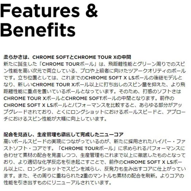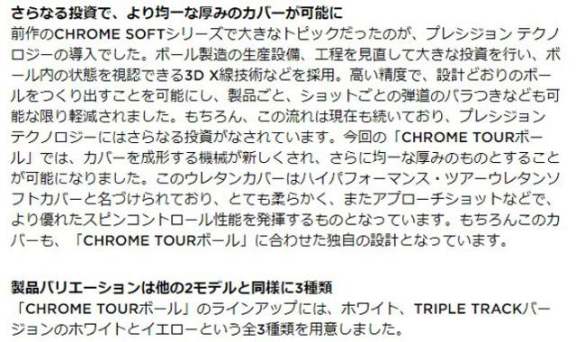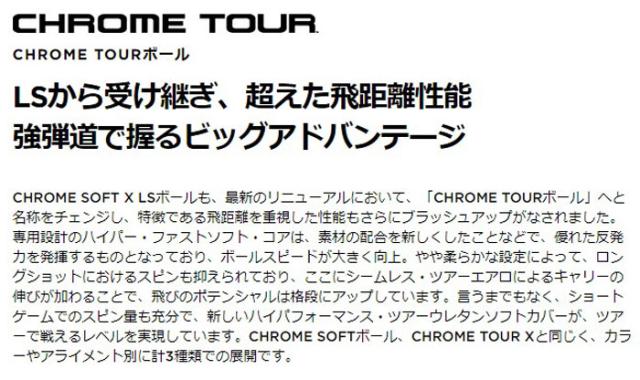 CHROMESOFTXLSボールも、最新のリニューアルにおいて、「CHROMETOURボール」へと名称をチェンジし、特徴である飛距離を重視した性能もさらにブラッシュアップがなされました。