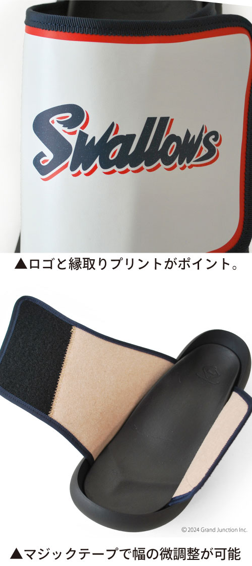■球団カラーを落とし込んだアッパーデザイン。甲を広く覆うカバーサンダルです。 シンプルな黒ソールにスワローズカラーの青と赤の配色。ファンにはたまらないロゴプリントで、観戦スタイルにもぴったり! 甲部分は面テープ(マジックテープ)となっており足に合わせて調節可能。しっかりフィットさせることで足裏とインソールとの密着度が高まり、歩行時のストレスを軽減します。