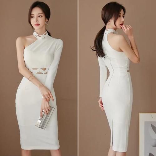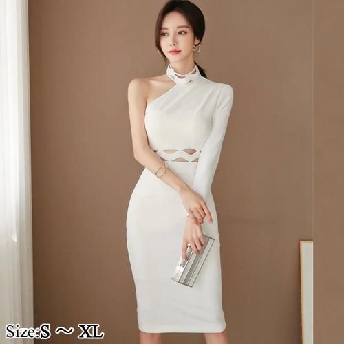 【グラシア】 キャバ ドレス キャバドレス ワンピース ミディアムドレス ワンショルダー タイト 大胆 伸縮性 ホワイト S M L XL