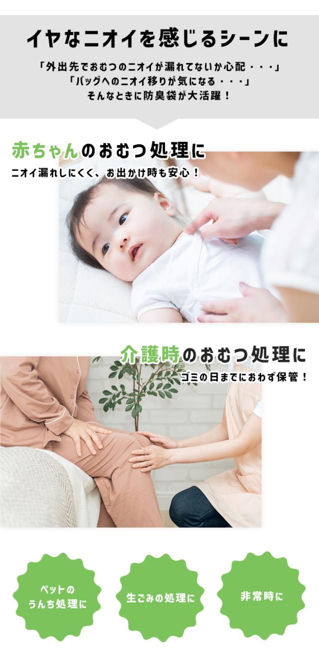お家の中やお出かけ中のあきらめていたそのニオイも、袋に入れて結ぶだけで簡単防臭!