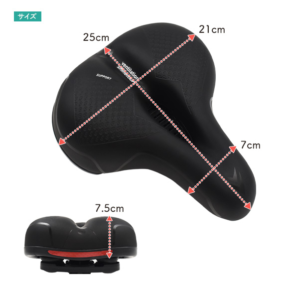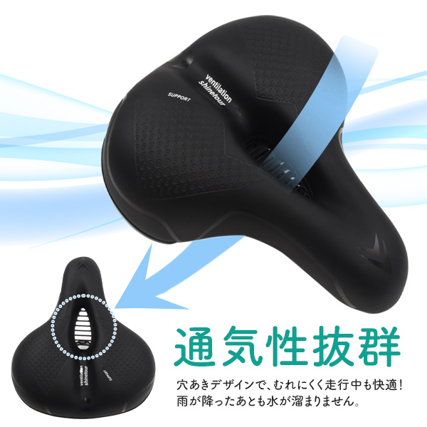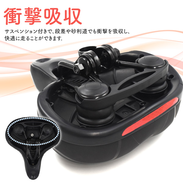 ワイドな座面でしっかり支えてくれます。 弾力性のある低反発のクッションで快適な座り心地。 表面にはPU素材を使用しているため滑りにくく、ストレスなく走行できます。 穴あきデザインで通気性が抜群!むれにくく走行中も快適です。 雨が降ったあとも水が溜まりません。 サスペンション付きで、段差や砂利道でも衝撃を吸収し、 快適に走ることができます。 | ||||||||||