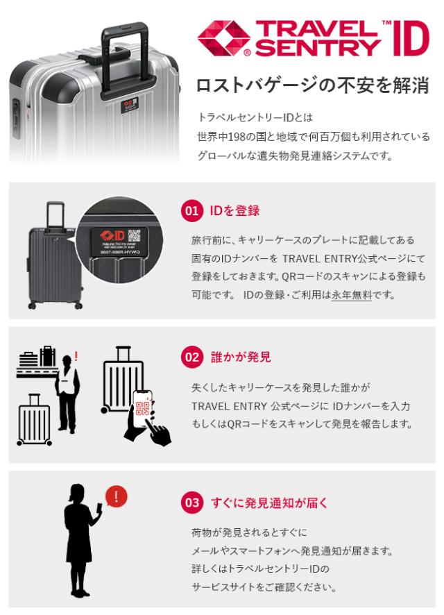 荷物の紛失時に発見率が向上するトラベルセントリーID付き。