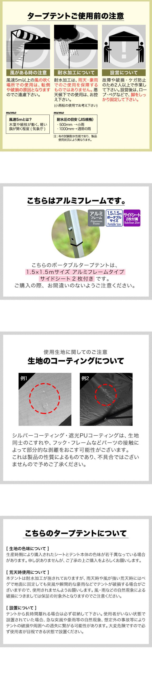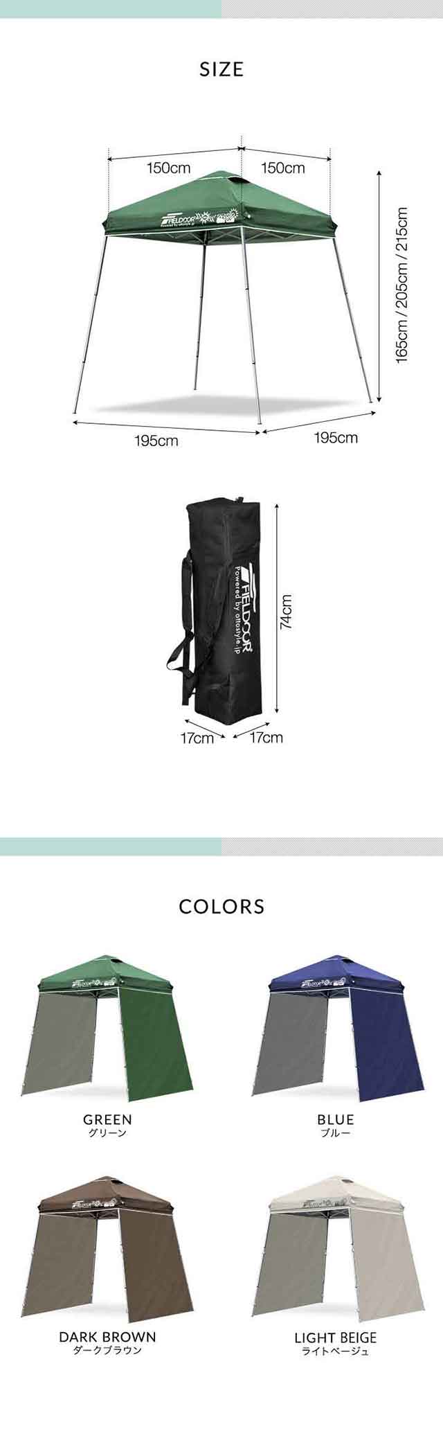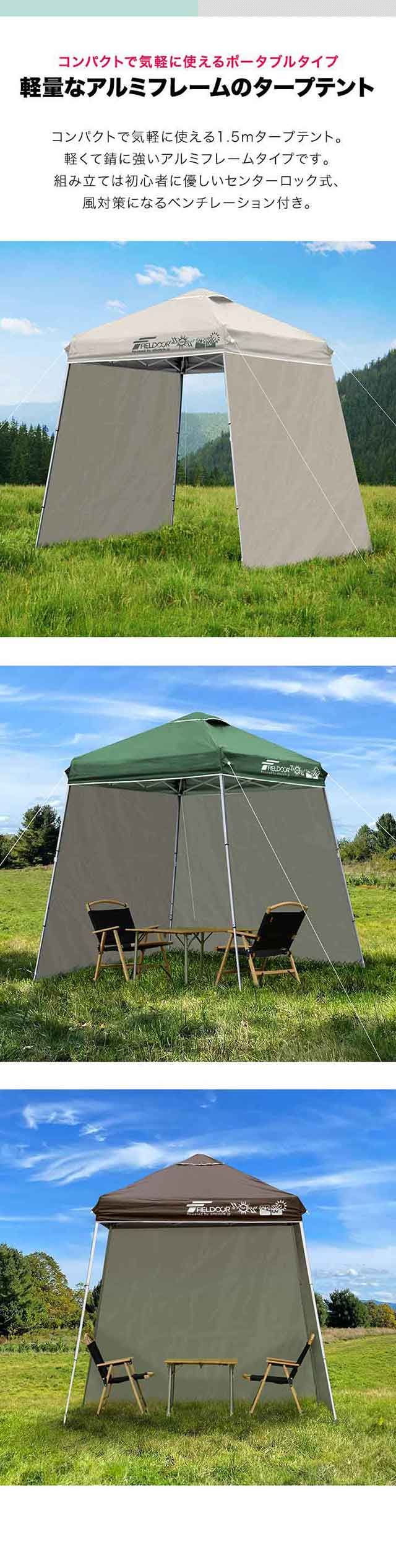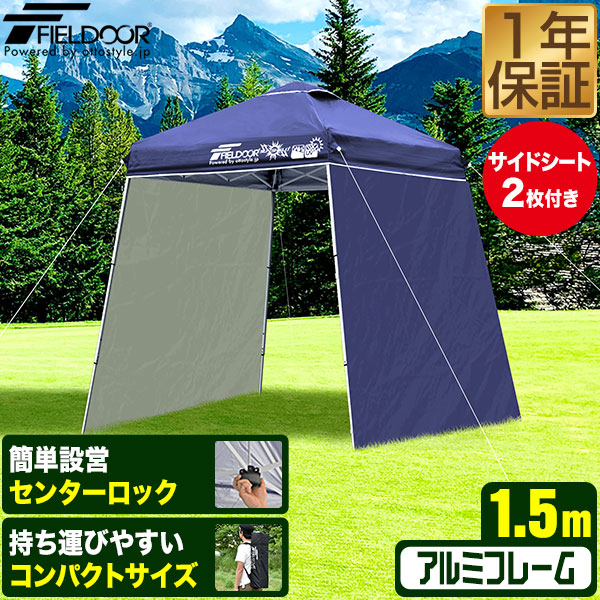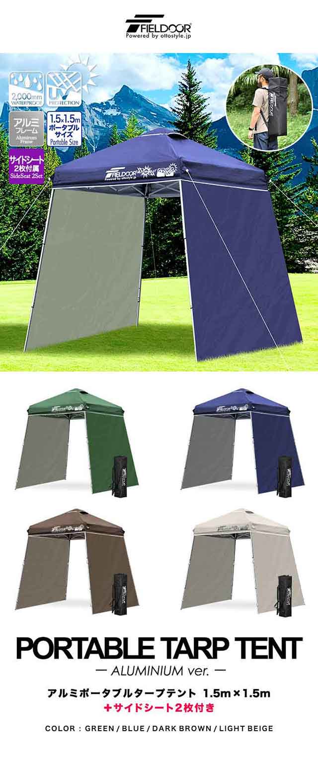 ポータブルタープ テント タープ サイドシート2枚付き 横幕セット 1.5m×1.5m 軽量 アルミ 150cm コンパクト 収納 小型 持ち運び 簡単 設営 ワンタッチタープ ワンタッチテント UV加工 撥水 ポータブルタープテント FIELDOOR 1年保証 送料無料