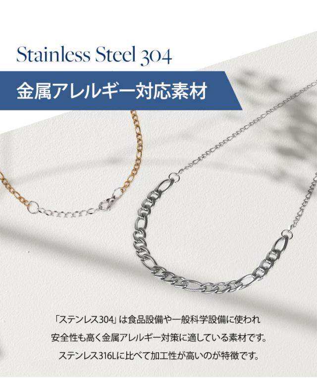 「 ステンレス304 」は、”錆びにくく変色も少ない”という特徴があります。そのため、汗などに接触しても金属が溶け出しにくく、アレルギー反応を起こしにくいので、近年金属アレルギー対応のジュエリー素材として使用されています。アレルギーの方でも安心・安全にオシャレを楽しんでいただきたいからこそ、素材にこだわりました。