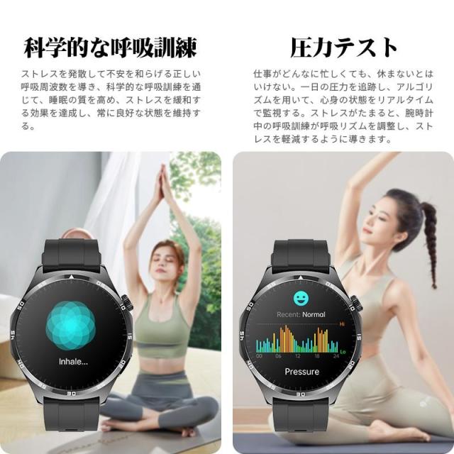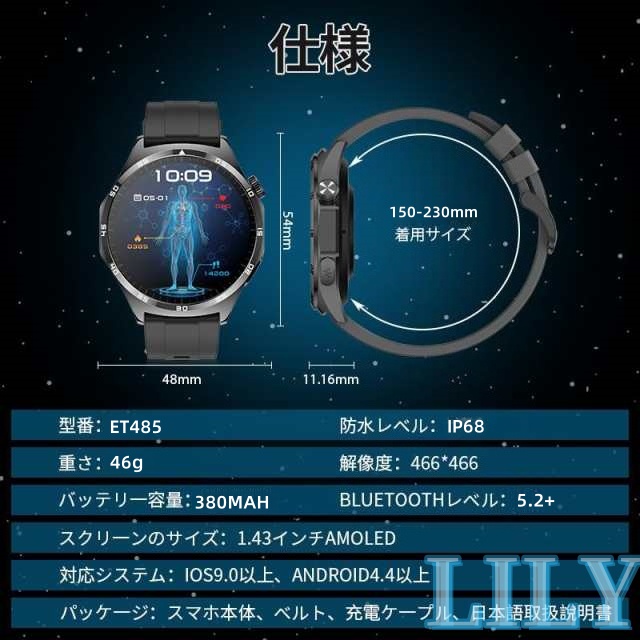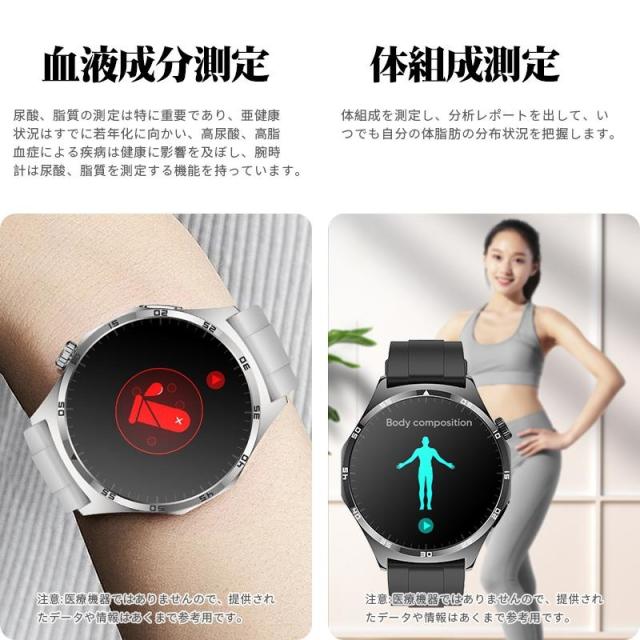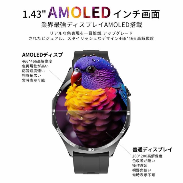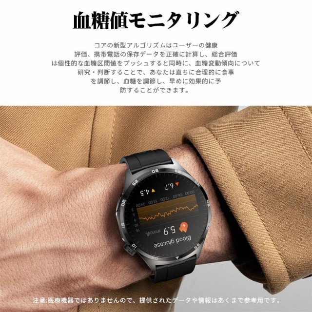 スマートウォッチ 日本製センサ ー 血糖値 血中酸素 通話機能 血液成分分析 心電図PGG+ECG 1.43インチ 丸形 血中酸素 血圧測定 高精度心拍数 呼吸率 体温 睡眠 IP68防水 着信通知