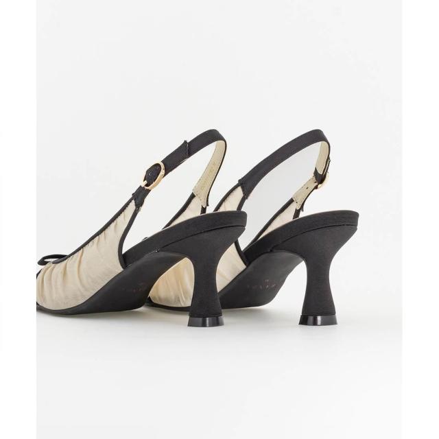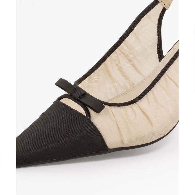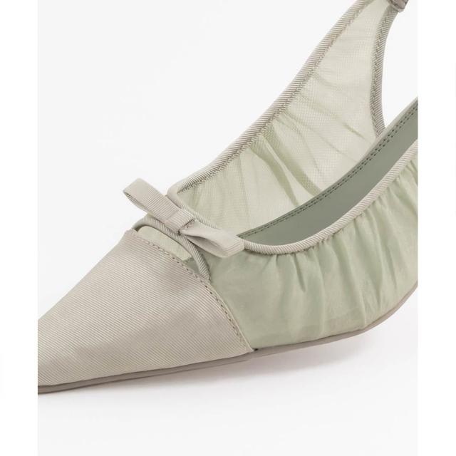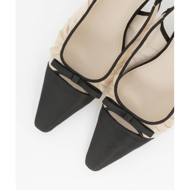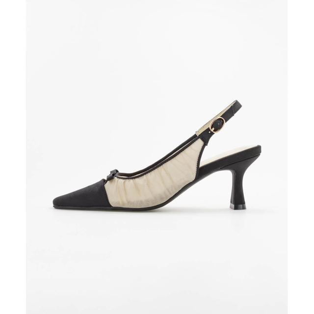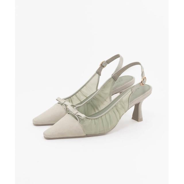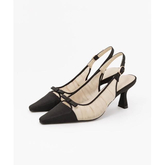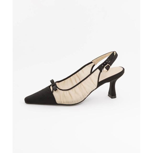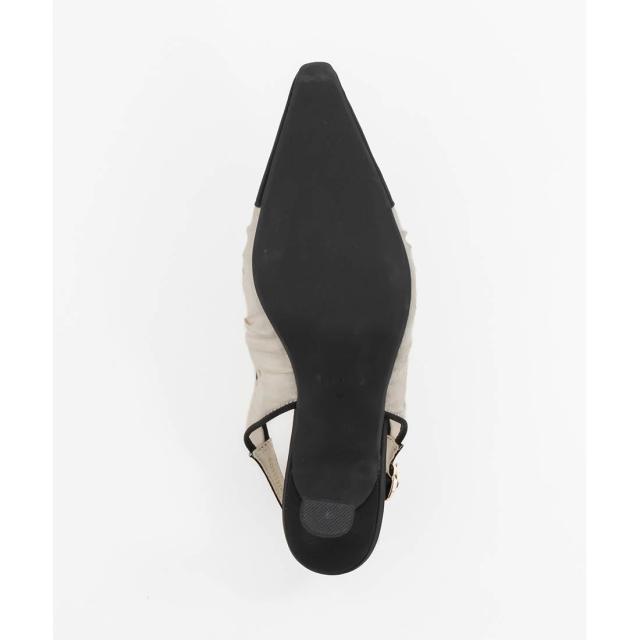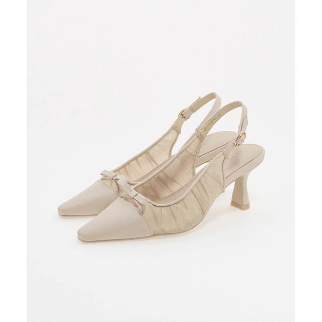 繊細なシアー素材にギャザーを施したデザインが目を惹くバックストラップパンプス。