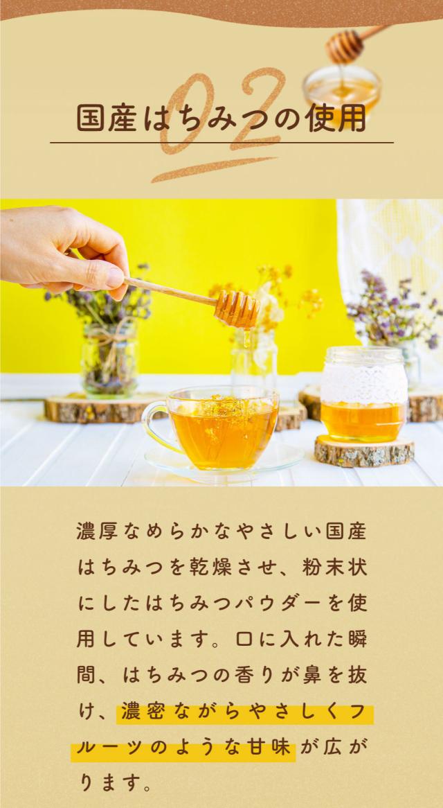 静岡県産の良質な茶葉を使用し、透明感のある美しい水色、香りも高く穏やかな渋みが味わえる紅茶に仕上げ、その茶葉に、国産はちみつパウダーを贅沢にブレンドしました。