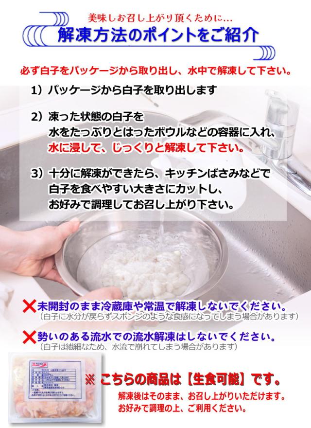 ◆ パックのまま冷蔵庫での解凍や常温での自然解凍、勢いのある流水での解凍は、商品の性質上お勧めできません。