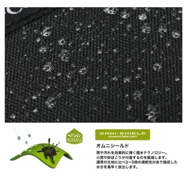 素材にコロンビア独自開発の撥水機能「オムニシールド」テクノロジーを施しており、水や汚れをしっかりと弾きます。