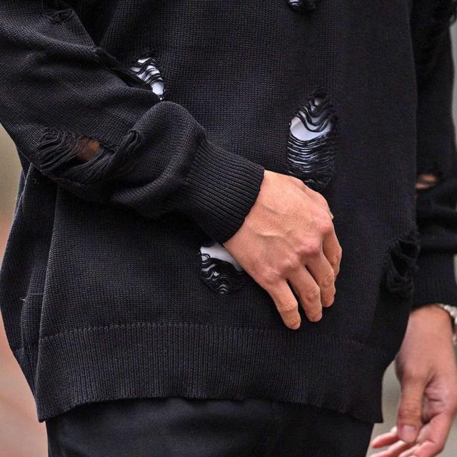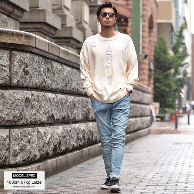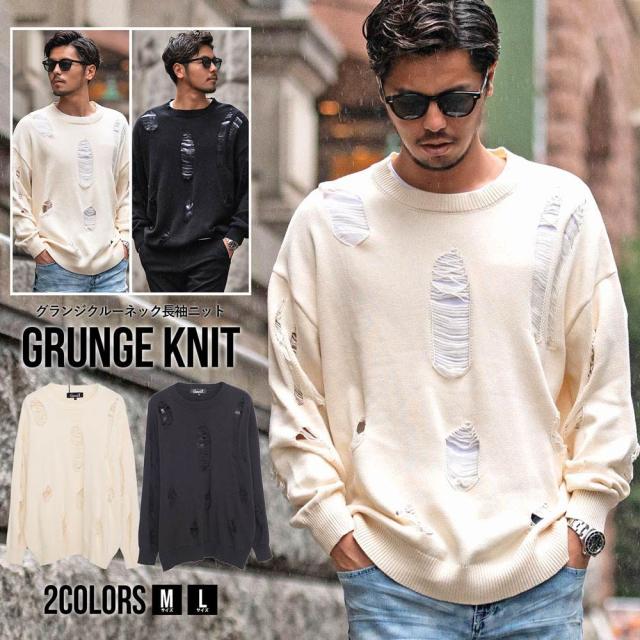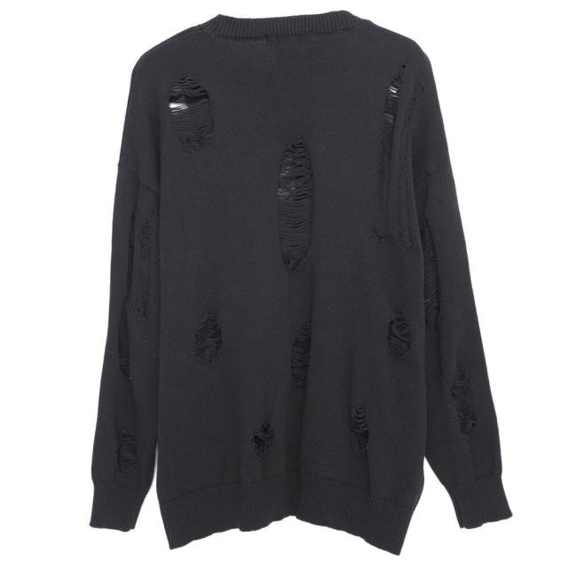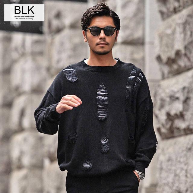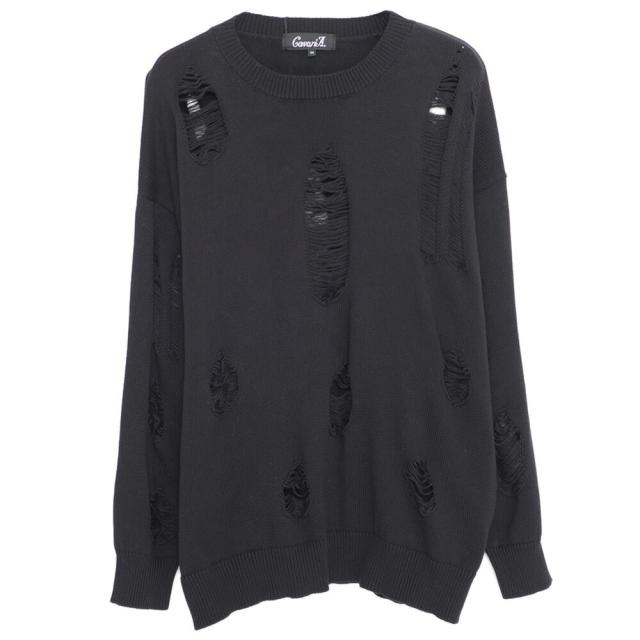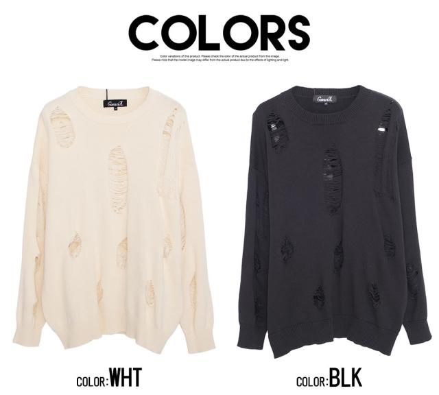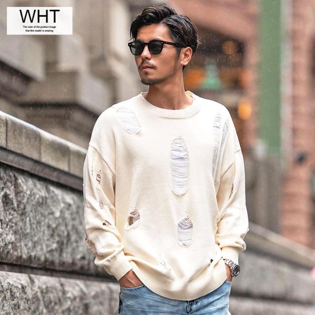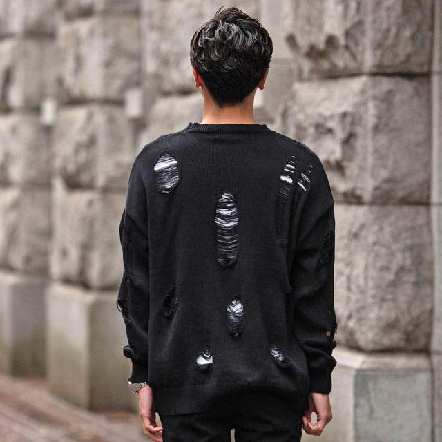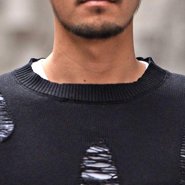 ニット メンズ ブランド おしゃれ 長袖 セーター ダメージ加工 穴あき ボロボロ ヴィンテージ ビンテージ クルーネック 丸首 無地 シンプル 大きいサイズ ビッグシルエット オーバーサイズ ゆったり ストレッチ 伸縮性 ユニセックス レディース ホワイト ブラック 白 黒 M L CavariA キャバリア 大人 モード カジュアル ストリート ストリート系 韓国 韓国系 韓国ファッション 下北沢 下北系 古着 古着系 90s 90年代 2000年代 Y2K 服 春 秋 冬 秋冬 男性 男 父の日 父の日ギフト 父の日プレゼント 20代 30代 40代 ファッション メンズファッション 東京 プレゼント 誕生日 記念日 贈り物 ギフト配送について