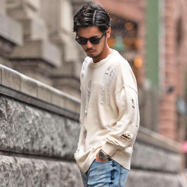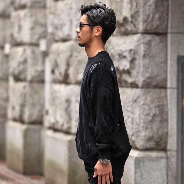 大胆なダメージ加工を施し古着のような風合いに仕上げたざっくりニット。