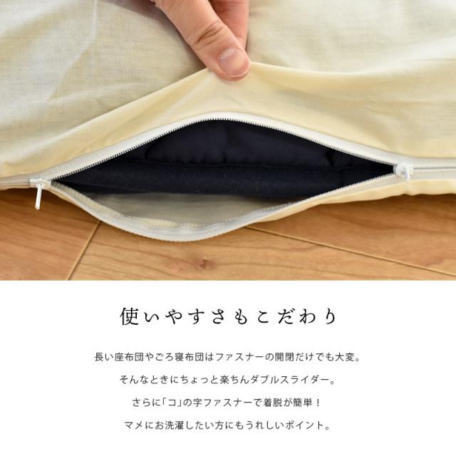| ・こだわりの日本製 生地の検品・採寸・裁断という縫製に至るまでの工程もメーカーの本社工房(国内)にて行う。例えばファスナーの開閉、例えばほつれのない美しさ…。使う中で感じる「本物」のこだわり。 ・シルク生まれの蛋白お肌にやさしい成分を表面に。シルクフィブロインという蛋白成分を微粉砕して、綿に付与。吸放湿性に優れてしっとり潤いある触れ心地に。皮脂を吸着する構造を持っている為、ベタつきがちな夏にも活躍。 ・使いやすさもこだわり長い座布団やごろ寝布団はファスナーの開閉だけでも大変。そんなときにちょっと楽ちんダブルスライダー。さらに「コ」の字ファスナーで着脱が簡単!マメにお洗濯したい方にもうれしいポイント。 | |
