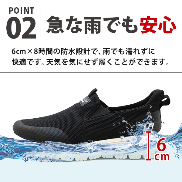 6cm×8時間の防水設計で、雨でも濡れずに快適です。天気を気にせず履くことができます。