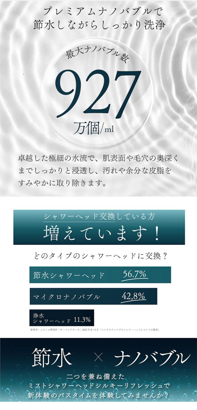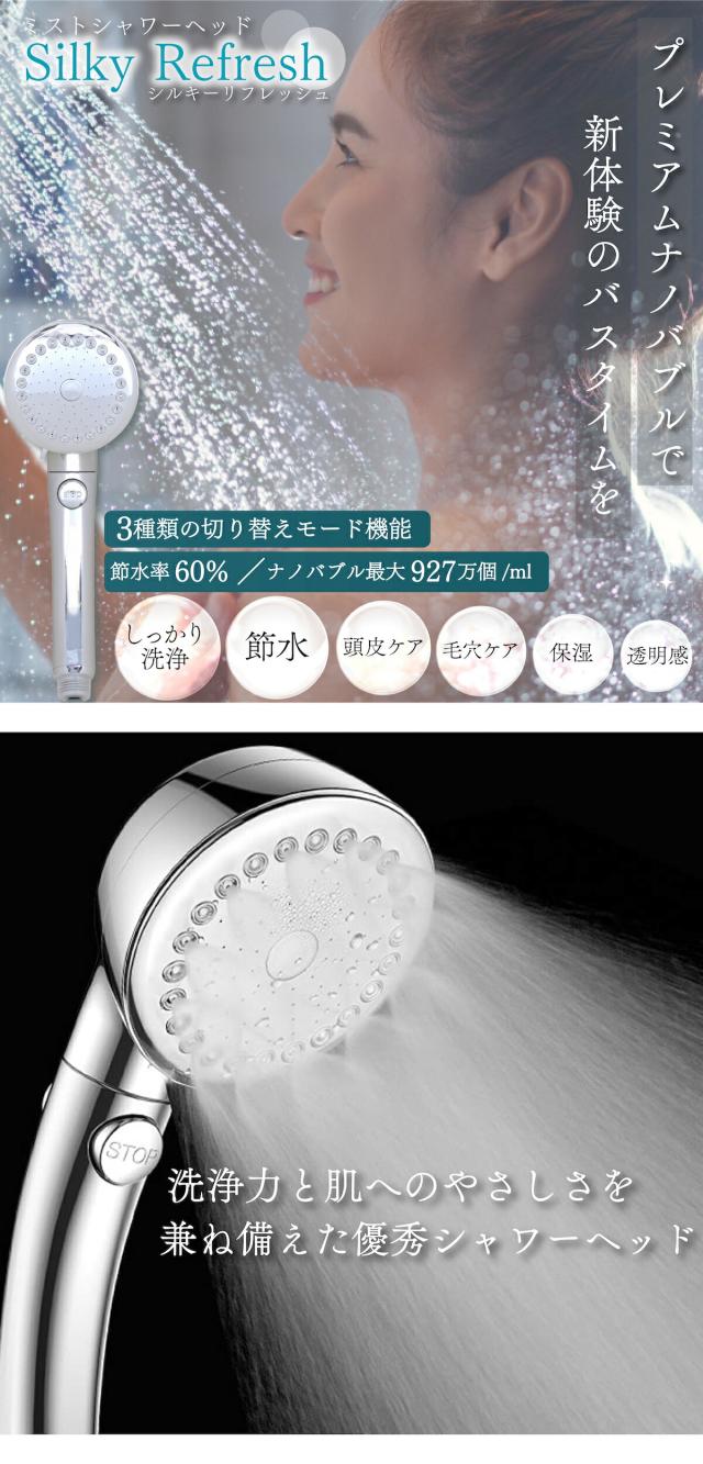 ミスト シャワーヘッド シルキーリフレッシュ プレミアム ナノバブル 高水圧 水流 タイプ切り替え 水流3種類 止水 通水 簡単 節水 節水シャワー 取付簡単 アダプター付 ヘアケア 頭皮 毛穴 汚れ 除去 うるおい 保湿 美肌 美髪 敏感肌 美容