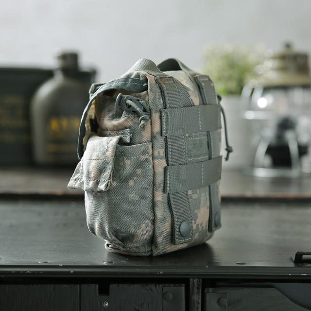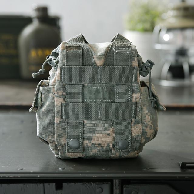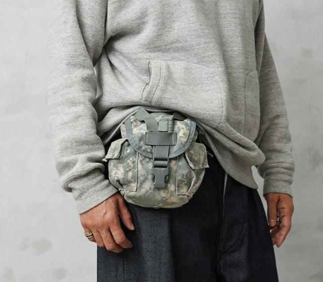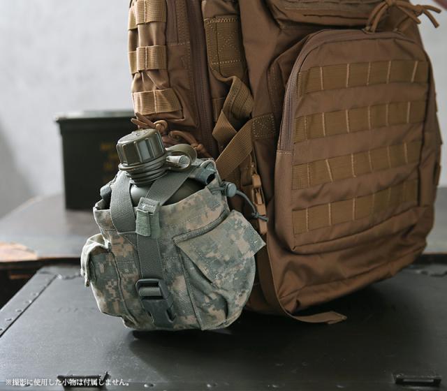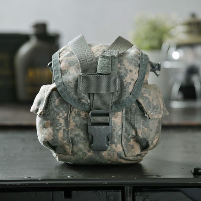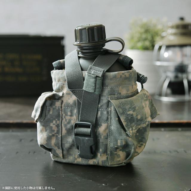 アメリカ陸軍が2005年に採用した迷彩服「ACU」に使用されたUCPの、約1Lの水筒“1QTキャンティーン”を入れるためのポーチが入荷しました。水筒だけでなく汎用ポーチとしても使用可能です。高さを調整することができるバックル付きのフラップに、ポーチの開口部はドローコードで絞り込むことができ重いキャンティーンもしっかりとサポート。MOLLE対応でウェビングが付いたバッグやベスト、ベルトなどに装着可能になっています。