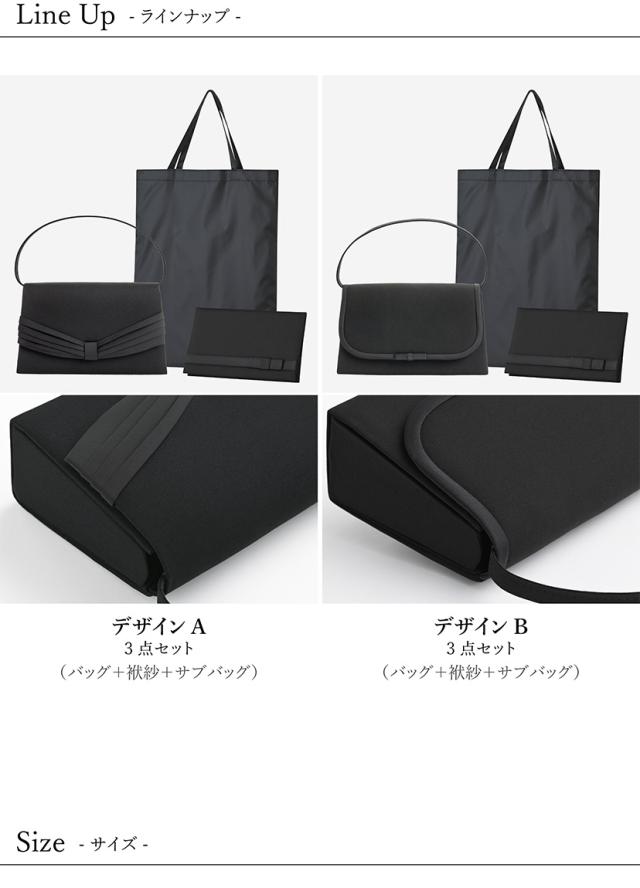 礼服、式典対応の2デザインからお選びいただけるフォーマルバッグ。バッグ+サブバッグ(A4)+ふくさ(袱紗)の3点セットです
