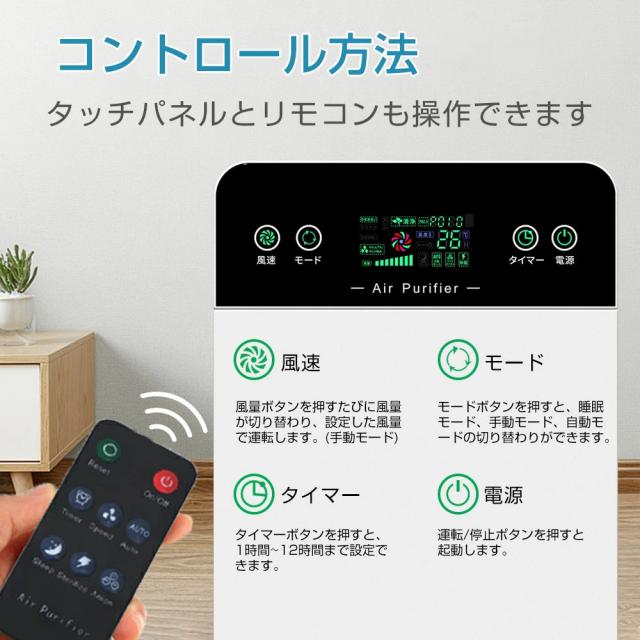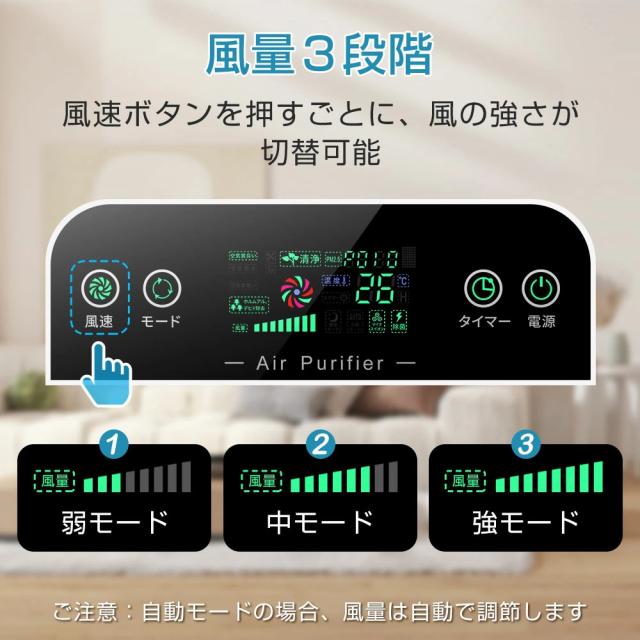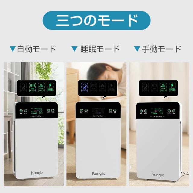 お部屋の空気の状態に合わせて、風量を調整可能、風量は、3段階(静音・標準・急速)で切り替えが可能。周り環境の空気質より作動効率が違って過熱安全保護の為、長時間(22時間以上の連続稼働)の使用後に自動的に電源が落ちます。