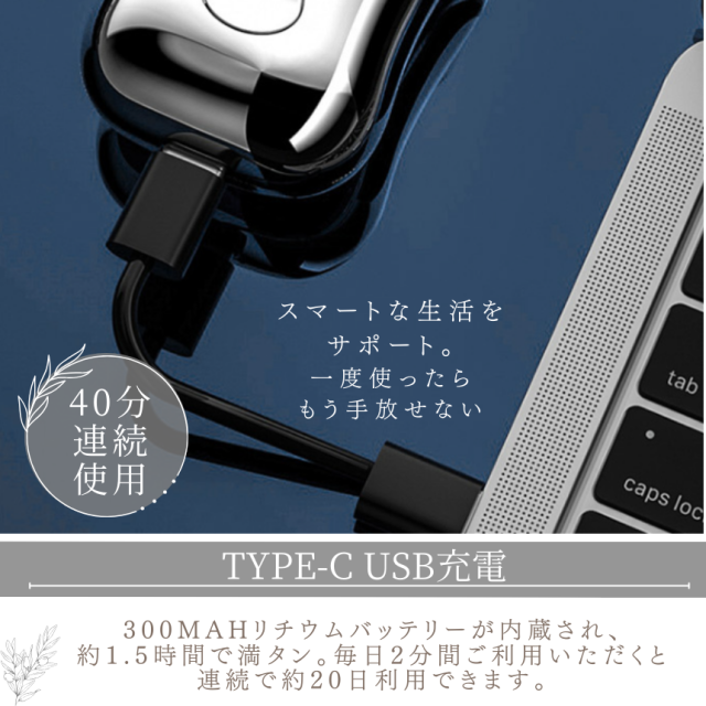 300mAhリチウムバッテリーが内蔵され、1.5時間だけで満タンになる。毎日2分間ご利用いただくと、連続で約20日利用できます。コンパクトな形でも長時間利用可能!