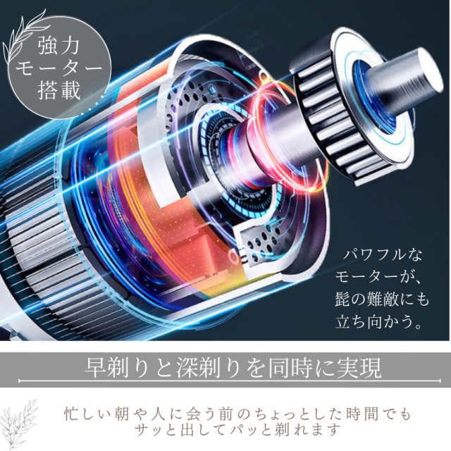 高品質アルミ合金ナイフネットと3枚内側刃が肌にやさしい。 超高速 回転のパワフルなモーターを 剃り難い短髭でも硬めの髭でも逃さず効果的にカット出来ます。