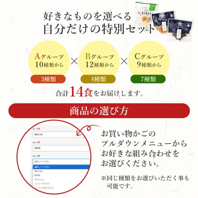| リニューアル内容 | 下記商品をBグループに追加し、選べる種類を27種から31種に変更しました。 国産鶏サラダチキンプレーン 100g 国産鶏サラダチキンブラックペッパー&ガーリック 100g 国産鶏サラダチキンカレー 100g 国産鶏サラダチキン長ネギ&生姜 100g |