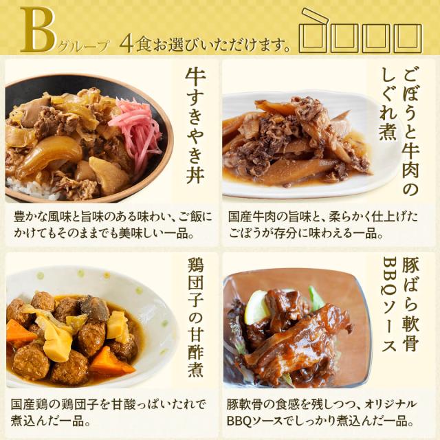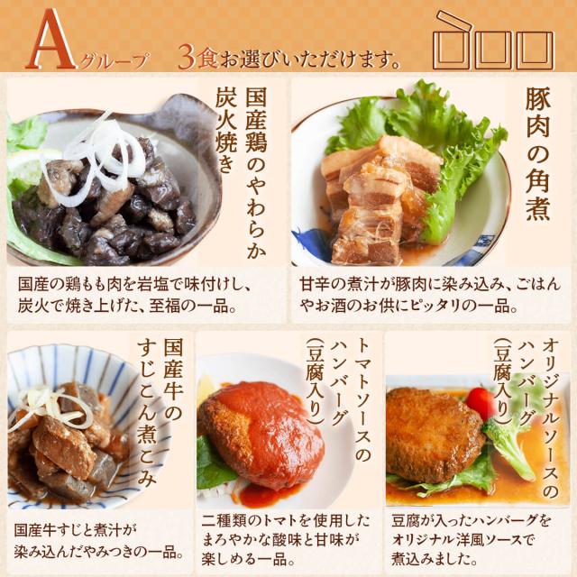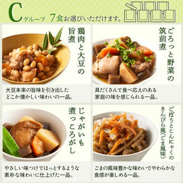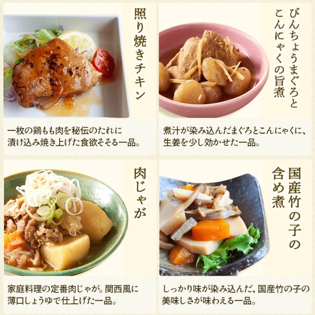 | 内容量 ※賞味期限 | ■ Aグループ 3食 国産鶏やわらか炭火焼き 80g 豚肉の角煮 120g 国産牛のすじこん煮こみ 110g トマトソースのハンバーグ(豆腐入り) 1個 オリジナルソースのハンバーグ(豆腐入り) 1個 鮭の塩焼き 1切 たっぷり野菜とあじの南蛮漬け 120g ぶり大根 125g さばの煮つけ 1切 さばの味噌煮 1切 ■ Bグループ 4食 牛すきやき丼 150g ごぼうと牛肉のしぐれ煮 100g 鶏団子の甘酢煮 125g 豚ばら軟骨 BBQソース 120g 照り焼きチキン 1切 びんちょうまぐろとこんにゃくの旨煮 125g 肉じゃが 160g 国産竹の子の含め煮 110g 国産鶏サラダチキンプレーン 100g 国産鶏サラダチキンブラックペッパー&ガーリック 100g 国産鶏サラダチキンカレー 100g 国産鶏サラダチキン長ネギ&生姜 100g ■ Cグループ 7食 鶏肉と大豆の旨煮 180g ごろっと野菜の筑前煮 120g じゃがいも煮っころがし 170g ごぼうとこんにゃくのきんぴら風(ごま風味) 120g ひじきの五目煮 110g 切り干し大根煮 110g 具だくさん卯の花 110g 昔ながらの金時豆煮 80g ひとくちふかしいも 75g 31種類の中から14食お選びいただけます。 |